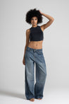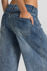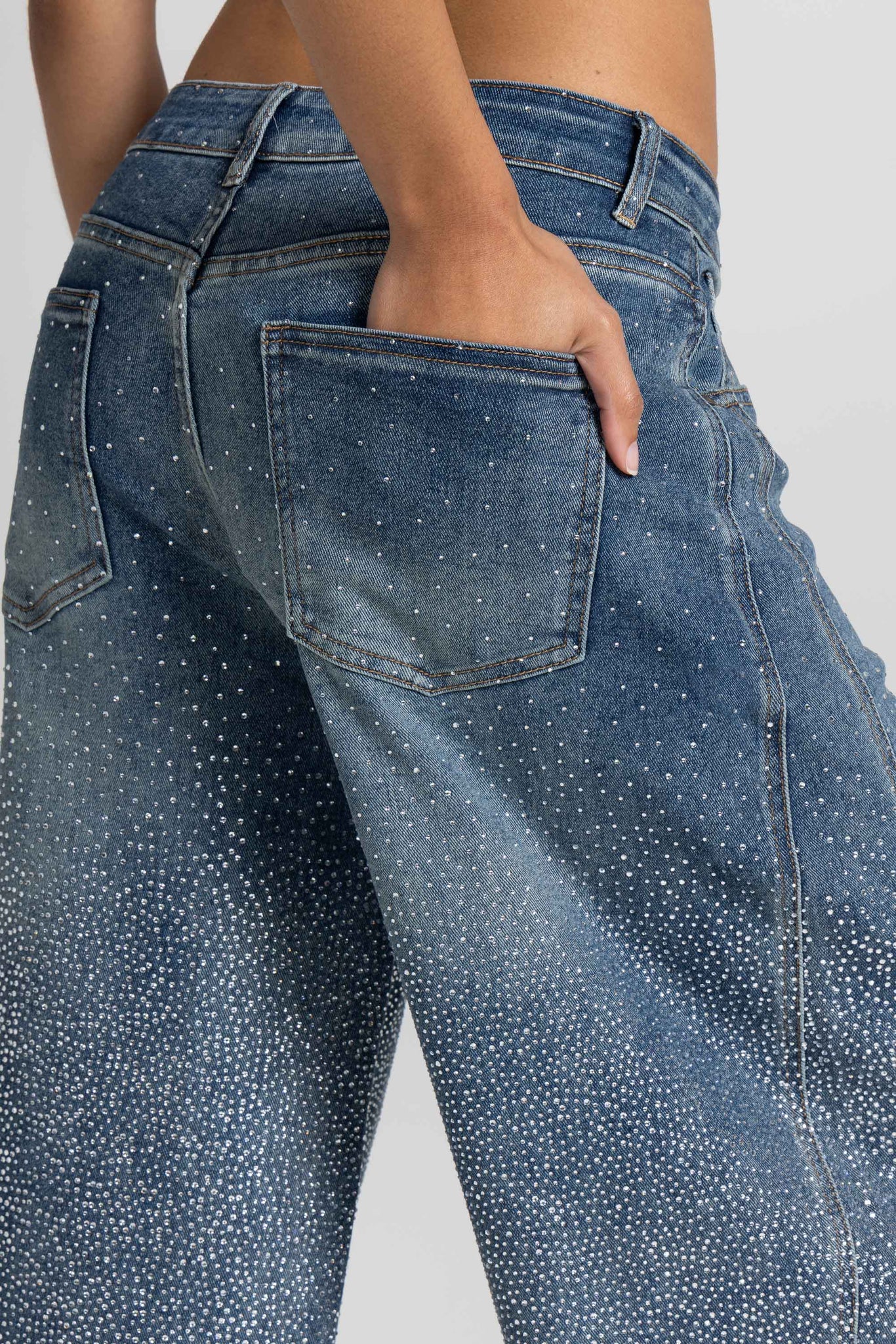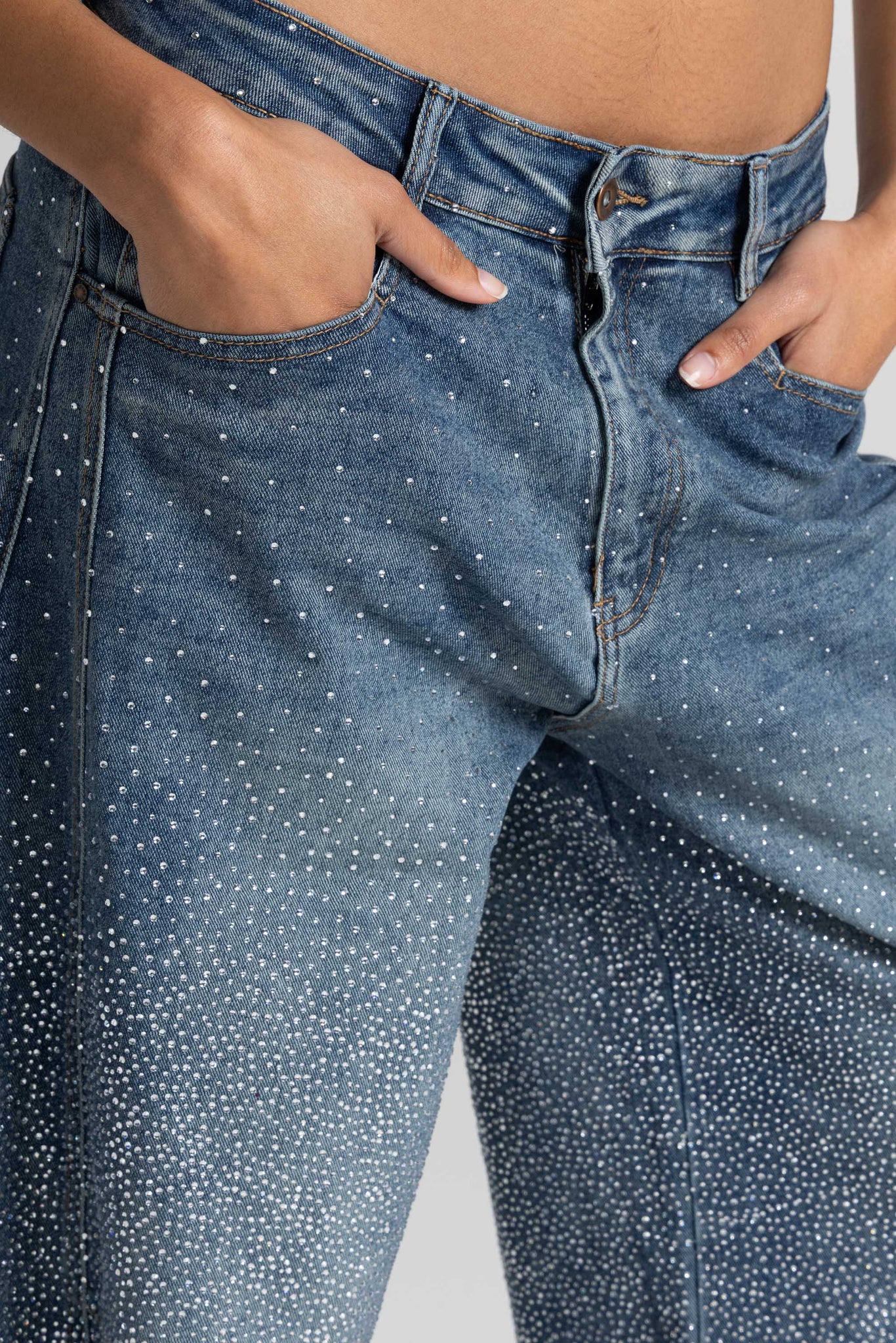 Denim blu, dalla texture morbida e dal lavaggio sfumato, impreziosito da una pioggia di micro strass luminosi che catturano la luce ad ogni passo, rendendoli un capo iconico e irresistibile. Un capo versatile, perfetto per look casual chic o sera elegante.