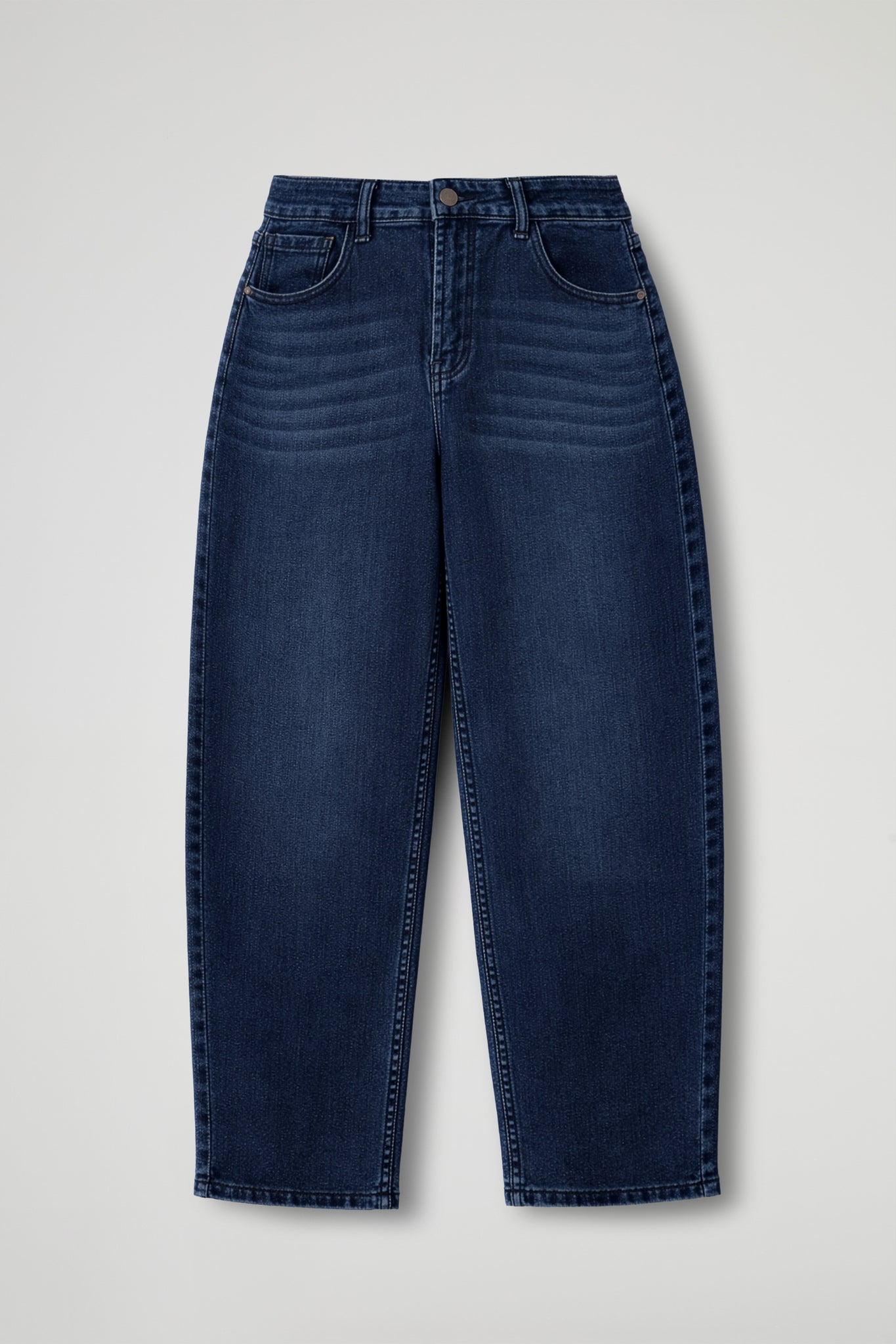 Jeans in denim blu scuro dal look pulito e versatile, con lavaggio scuro e leggere schiariture sul davanti che donano un effetto vissuto discreto; vita medio-alta, costruzione 5 tasche con passanti e chiusura bottone + zip, gamba morbida con curva delicata, perfetto per look casual e quotidiani.