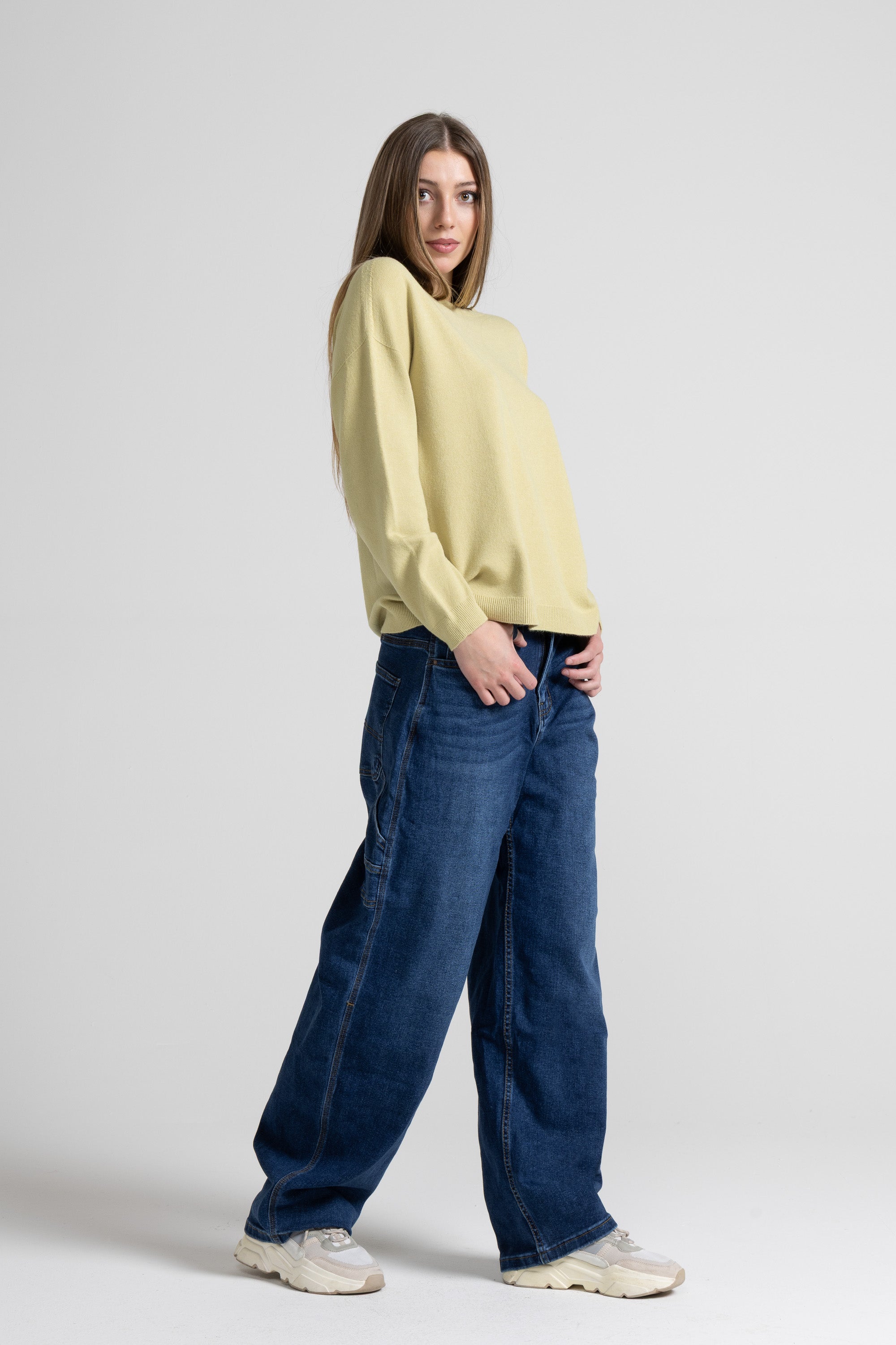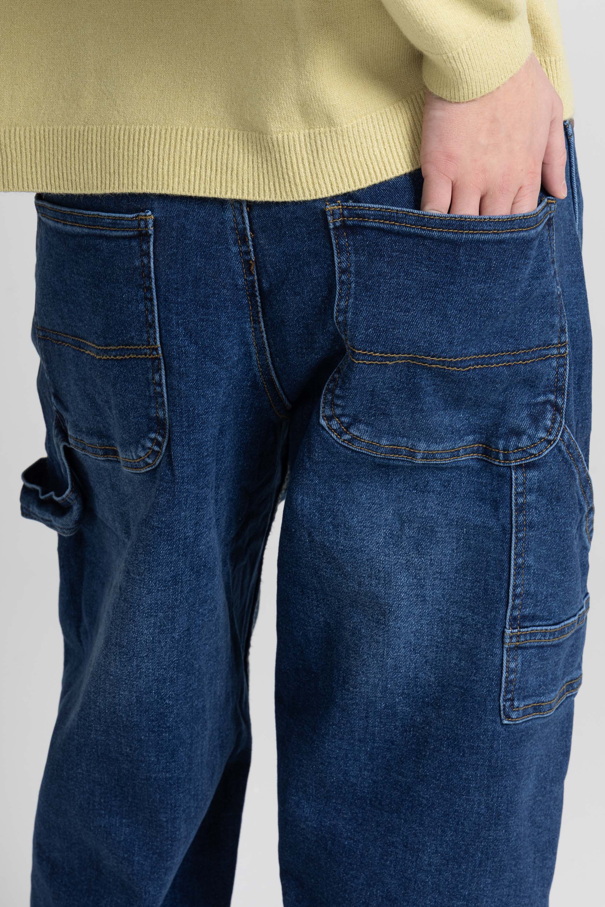 Jeans dal taglio leggermente baggy, lavaggio sfumato effetto vissuto, vita alta, chiusura frontale con bottone e zip, 5 tasche, gamba ampia e morbida, dettaglio cargo sul lato con pattina applicata, impunture a contrasto.