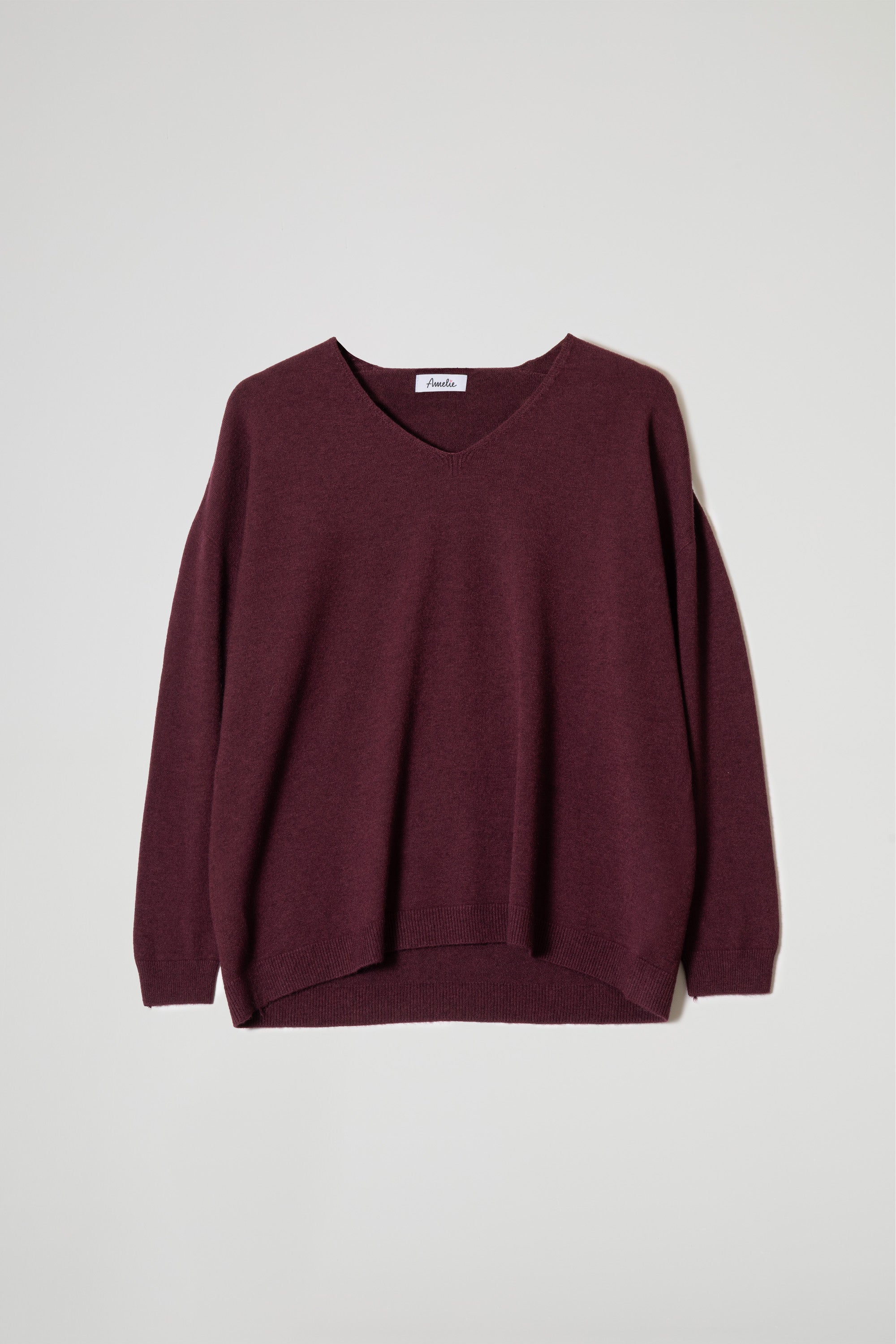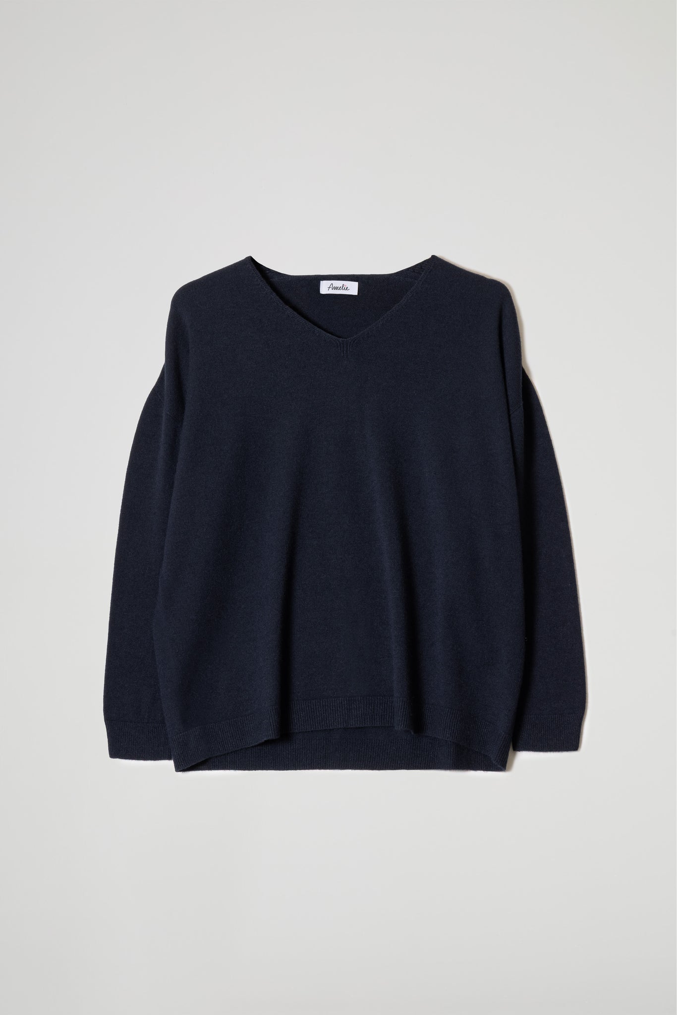 Scollo a V dal bordo pulito a coste sottili, spalla scesa, manica lunga, polsini e fondo con bordatura elasticizzata a coste. Linea ampia