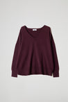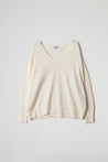 Scollo a V con dettaglio a coste sottili con rinforzo centrale a doppio filo, spalla leggermente scesa, maniche lunghe con polsini a costina alta, sul fondo lavorazione a bordo alto con motivo sagomato. Linea comfort