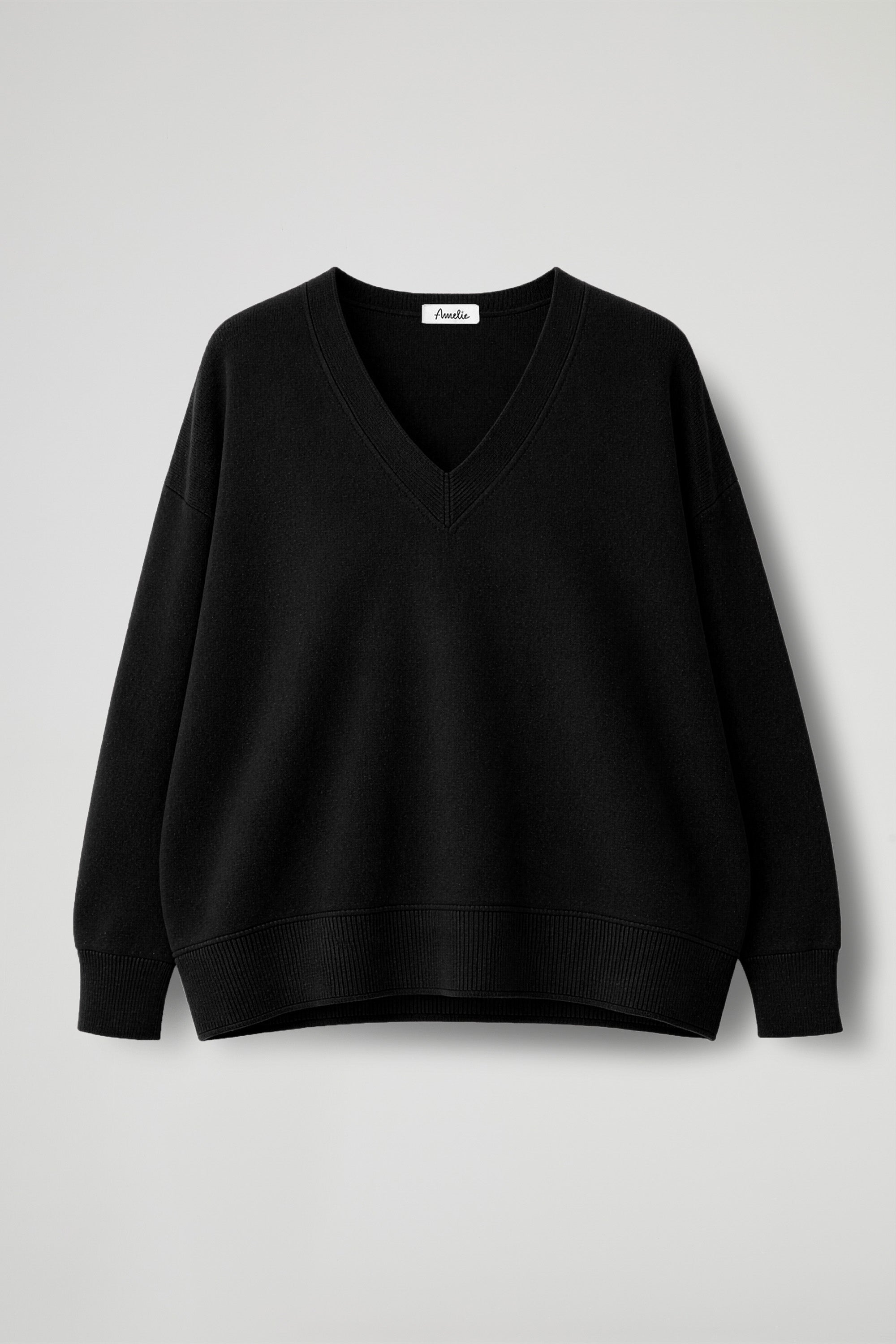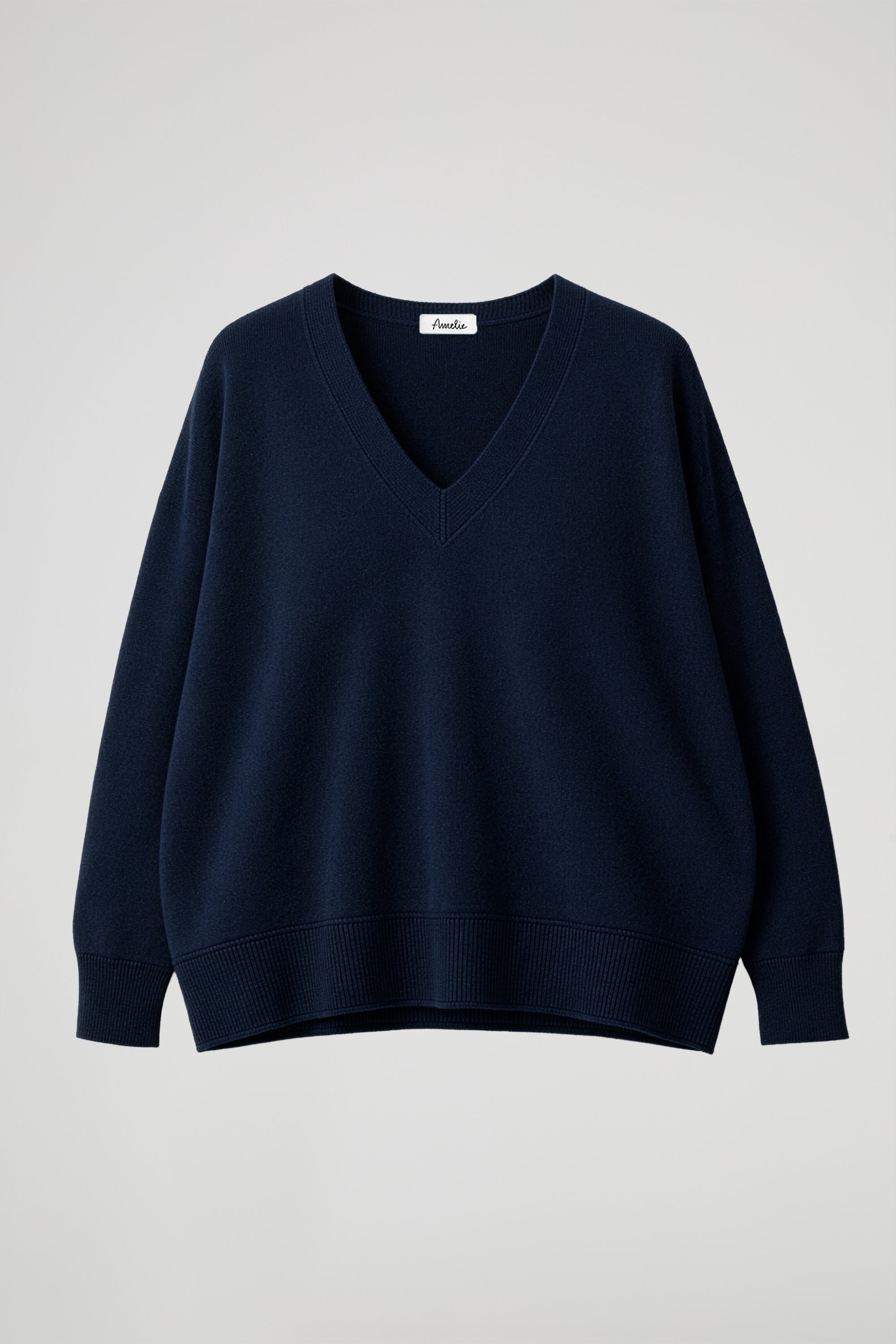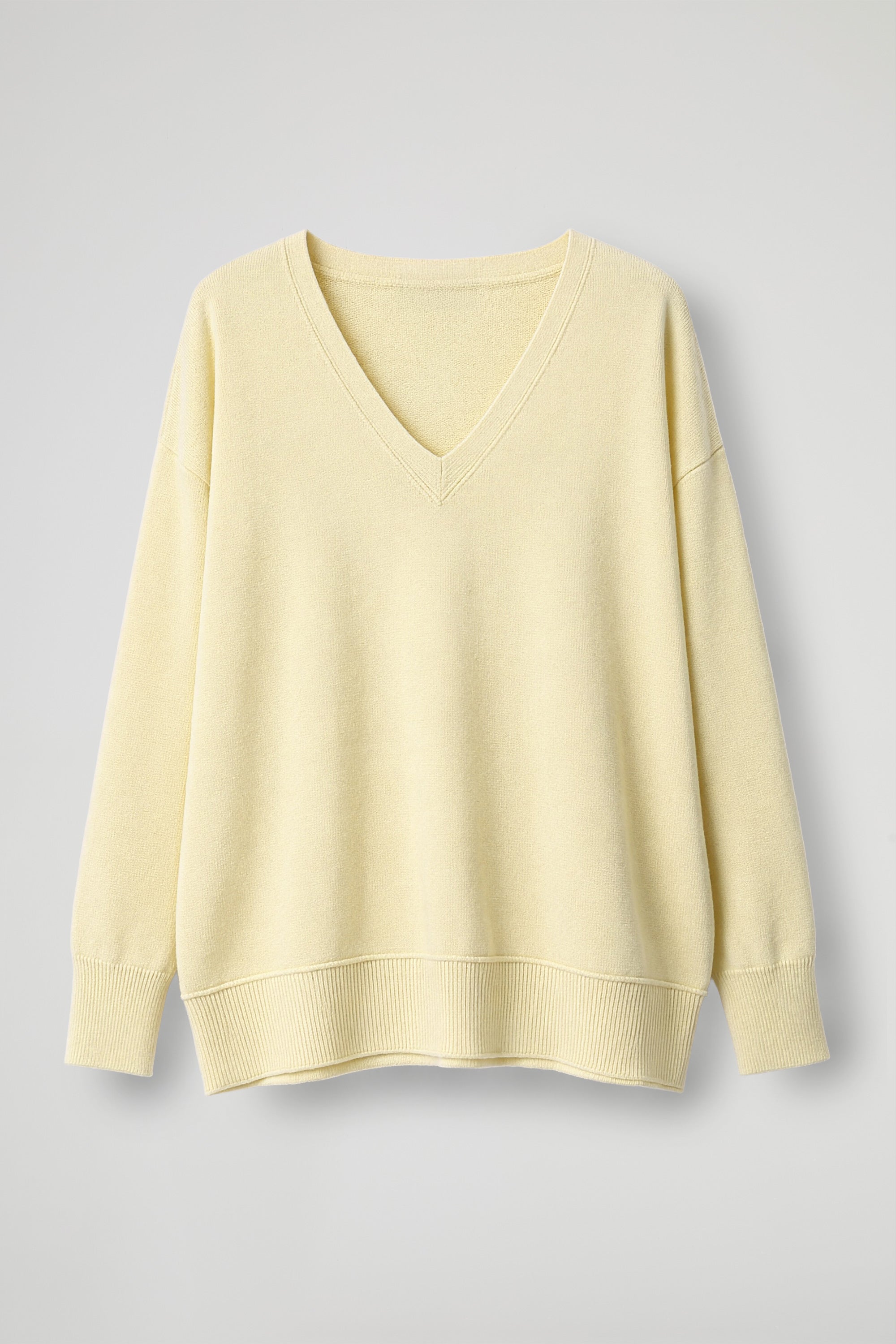 Maglia Over, scollo a V rifinito a coste, spalla scesa, manica lunga con dettaglio polsino alto a costine elasticizzato, fondo stondato con orlo alto a costine. Linea ampia.