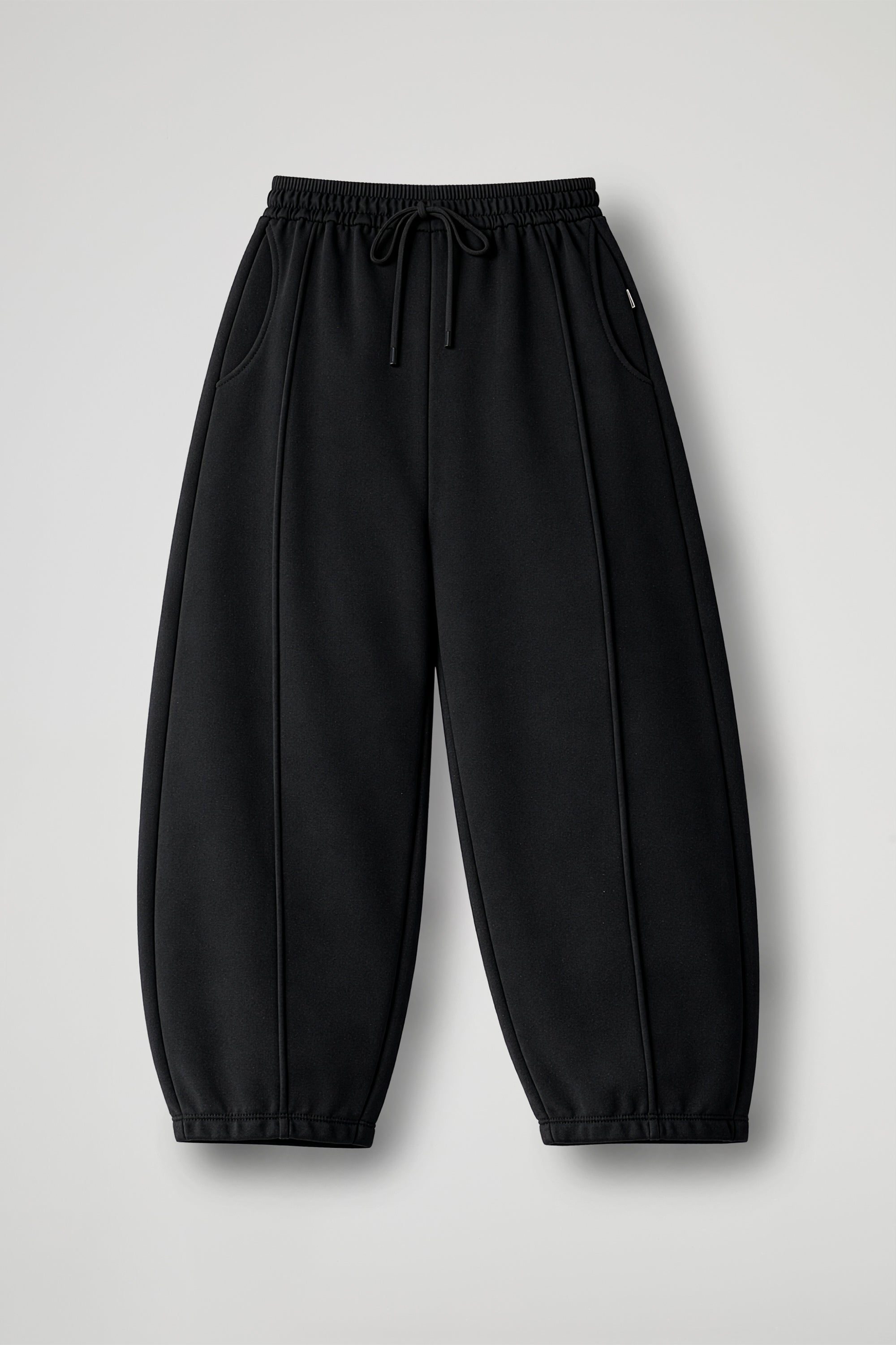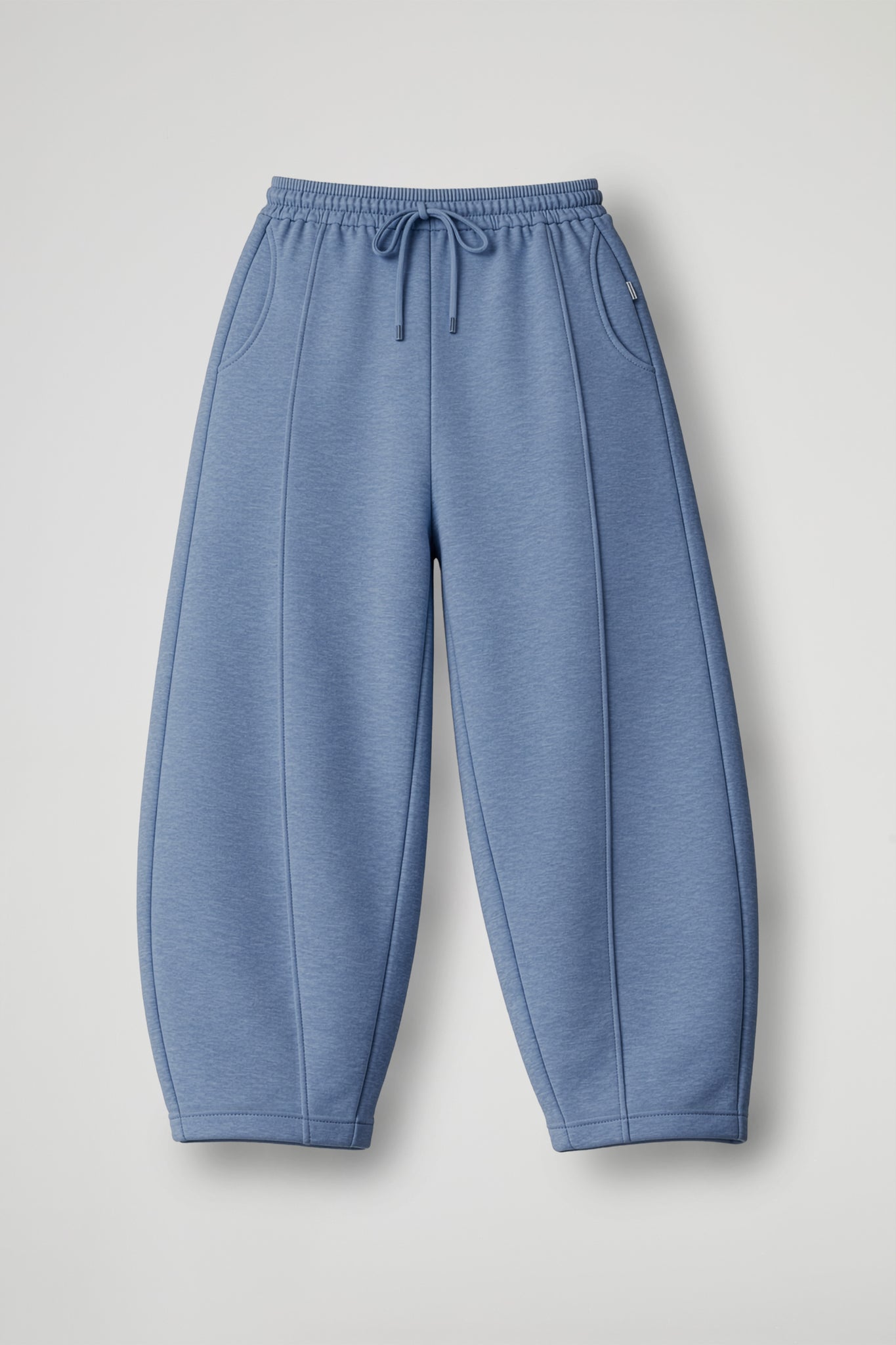 Taglio baggy, vita elastica con coulisse regolabile in tono, due tasche laterali, cucitura centrale frontale, orlo ribattuto sul fondo. Linea ampia