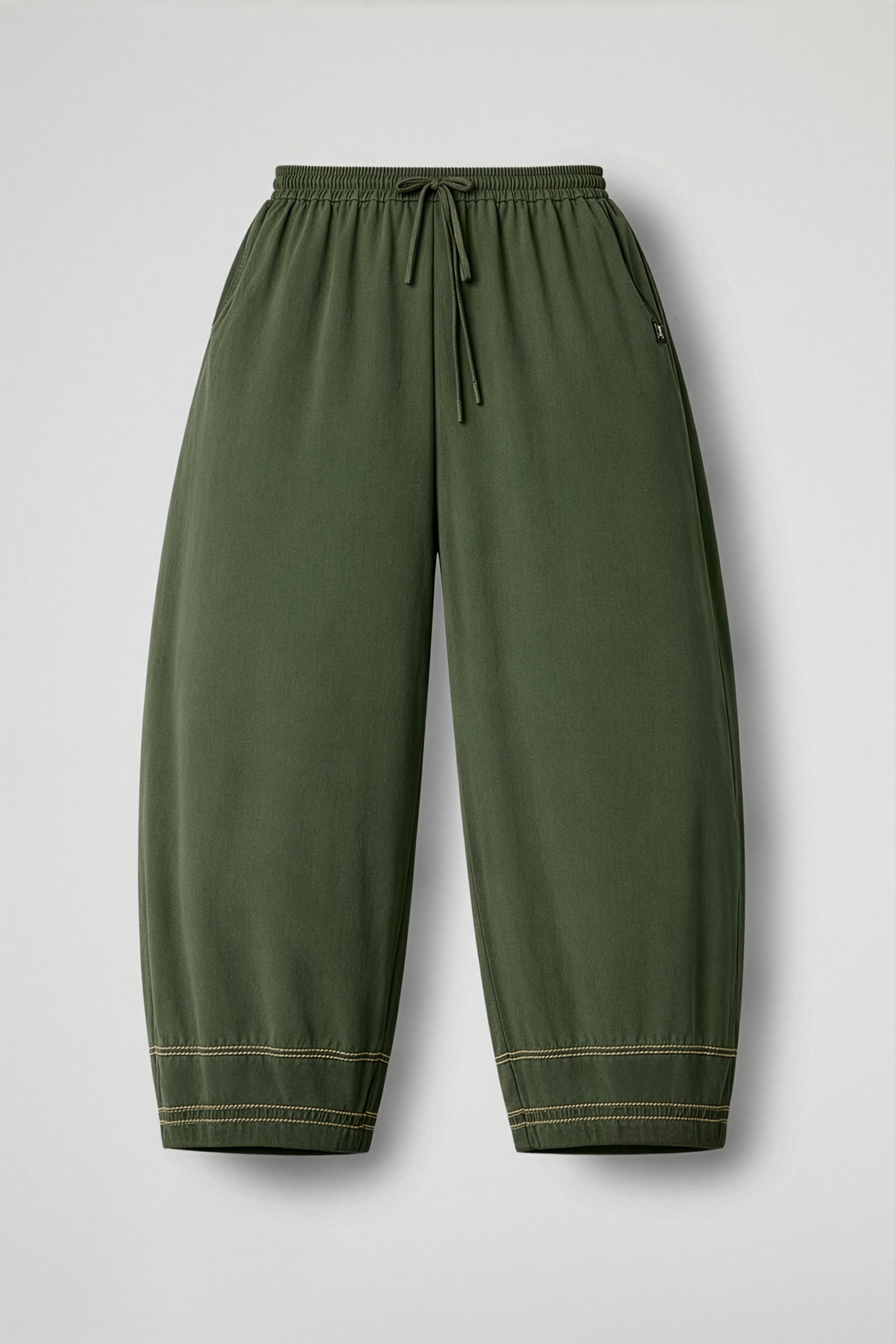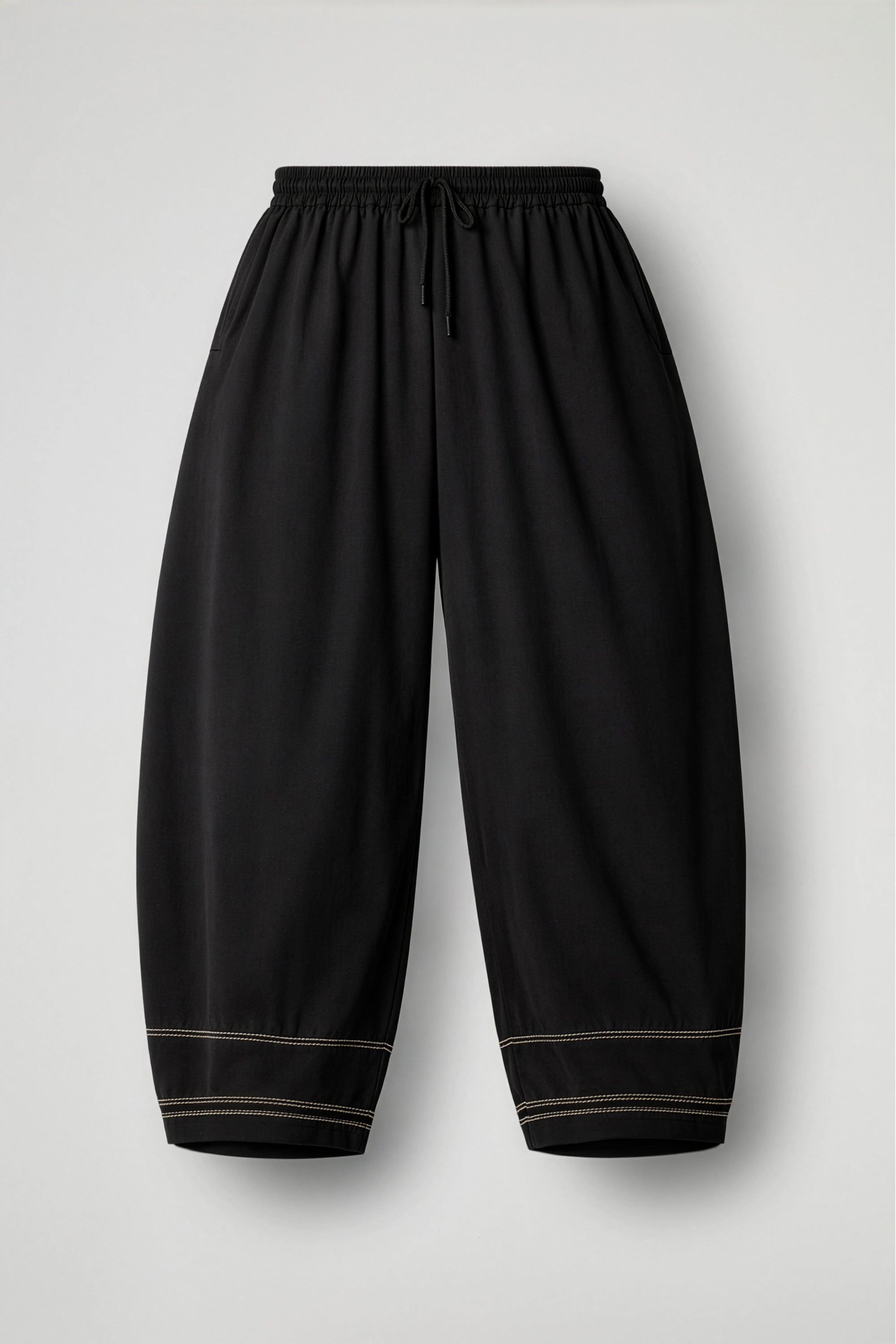 Pantalone baggy, elastico in vita con coulisse regolabile, tasche stondate, gamba ampia, taglio a carrè sul retro, cuciture a contrasto sul fondo. Linea confortevole