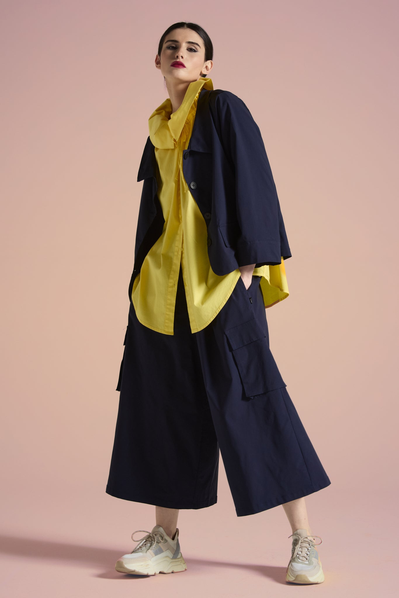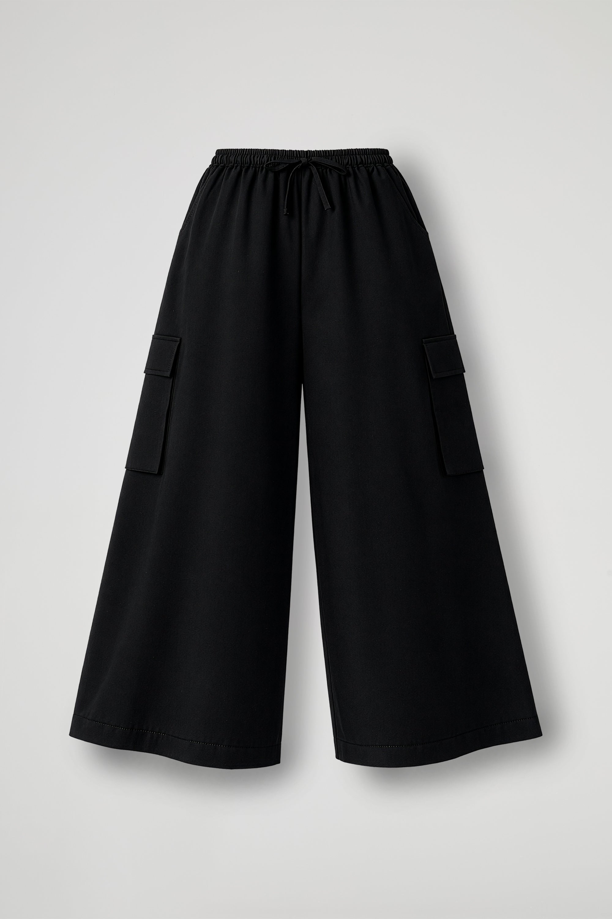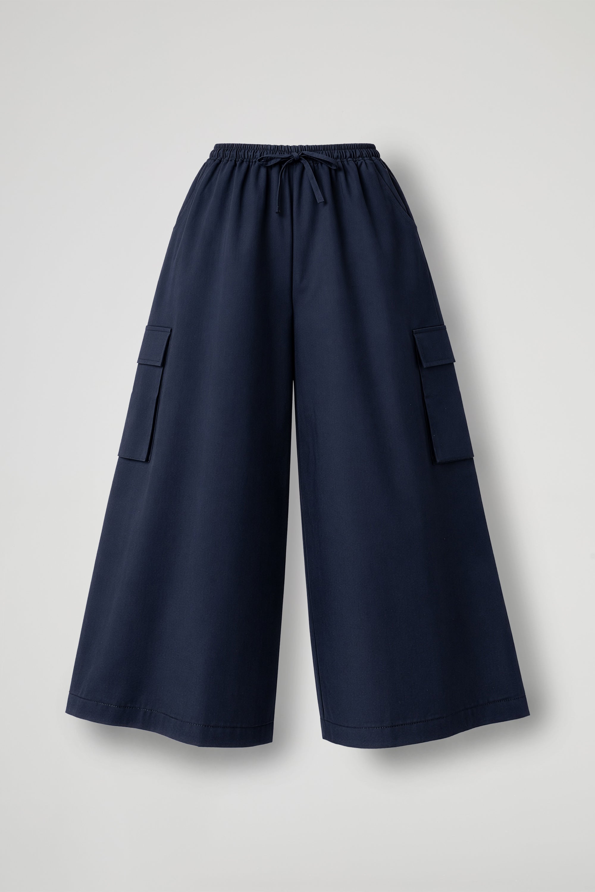 Pantaloni culotte, elastico con coulisse regolabile in vita, tasche all americana, tasche laterali cargo con patta, gamba ampia, orlo ribattuto alto sul fondo. Linea ampia