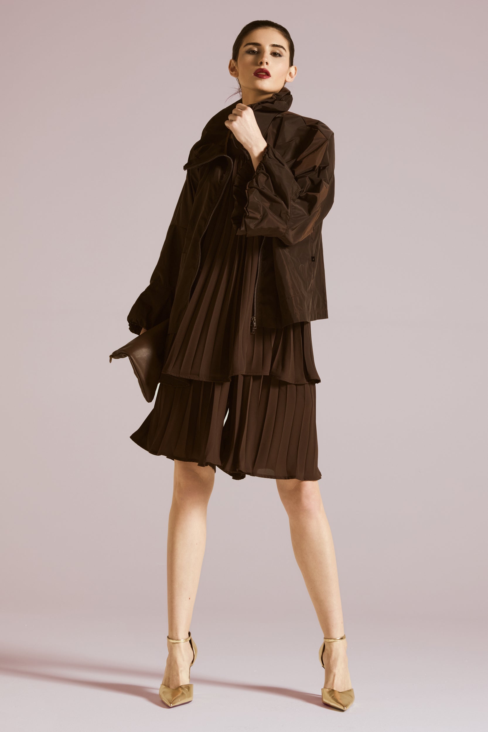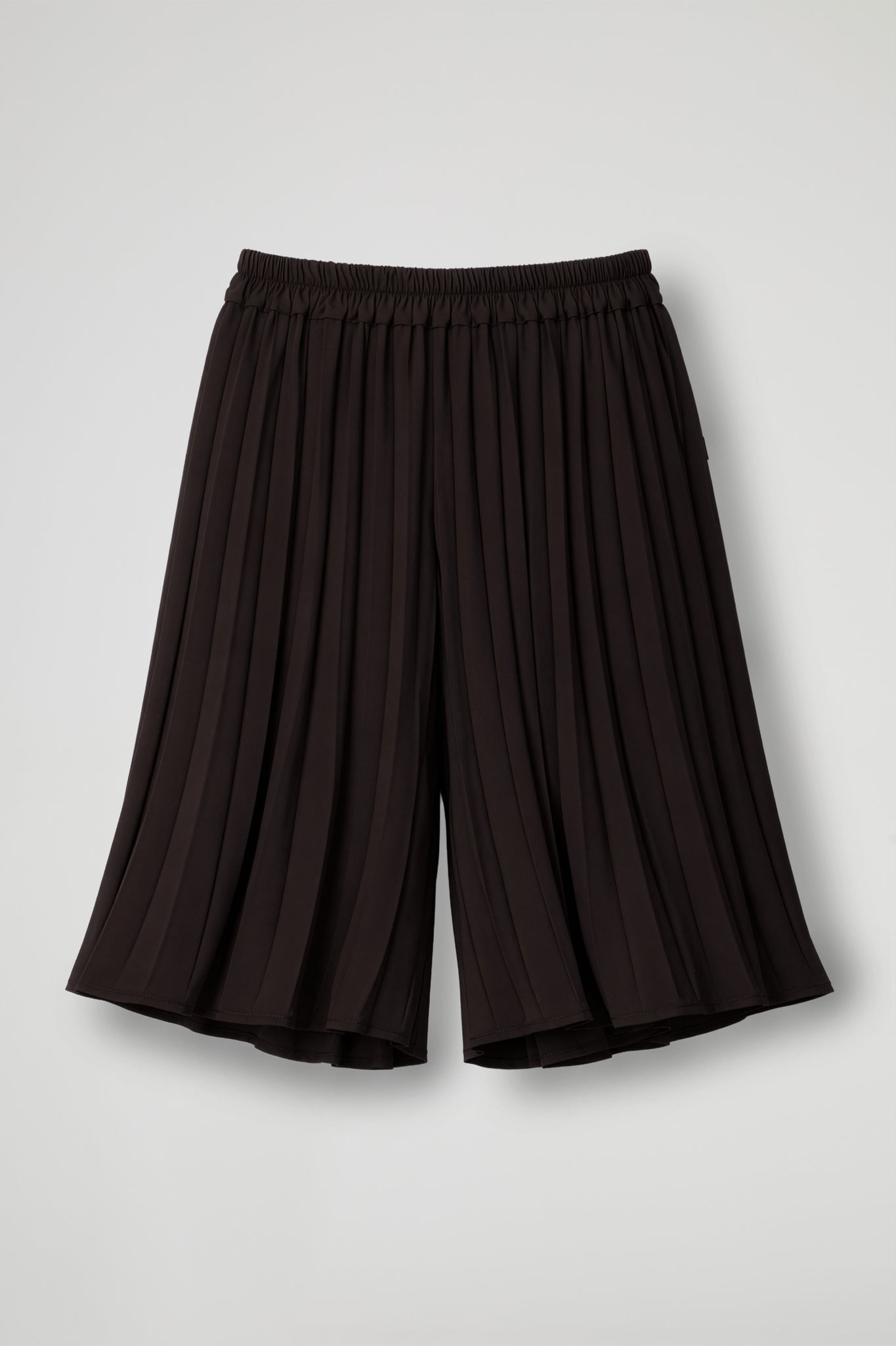 Shorts-gonna, elastico in vita, tasche a filo, costruzione a pieghe. Linea svasata.