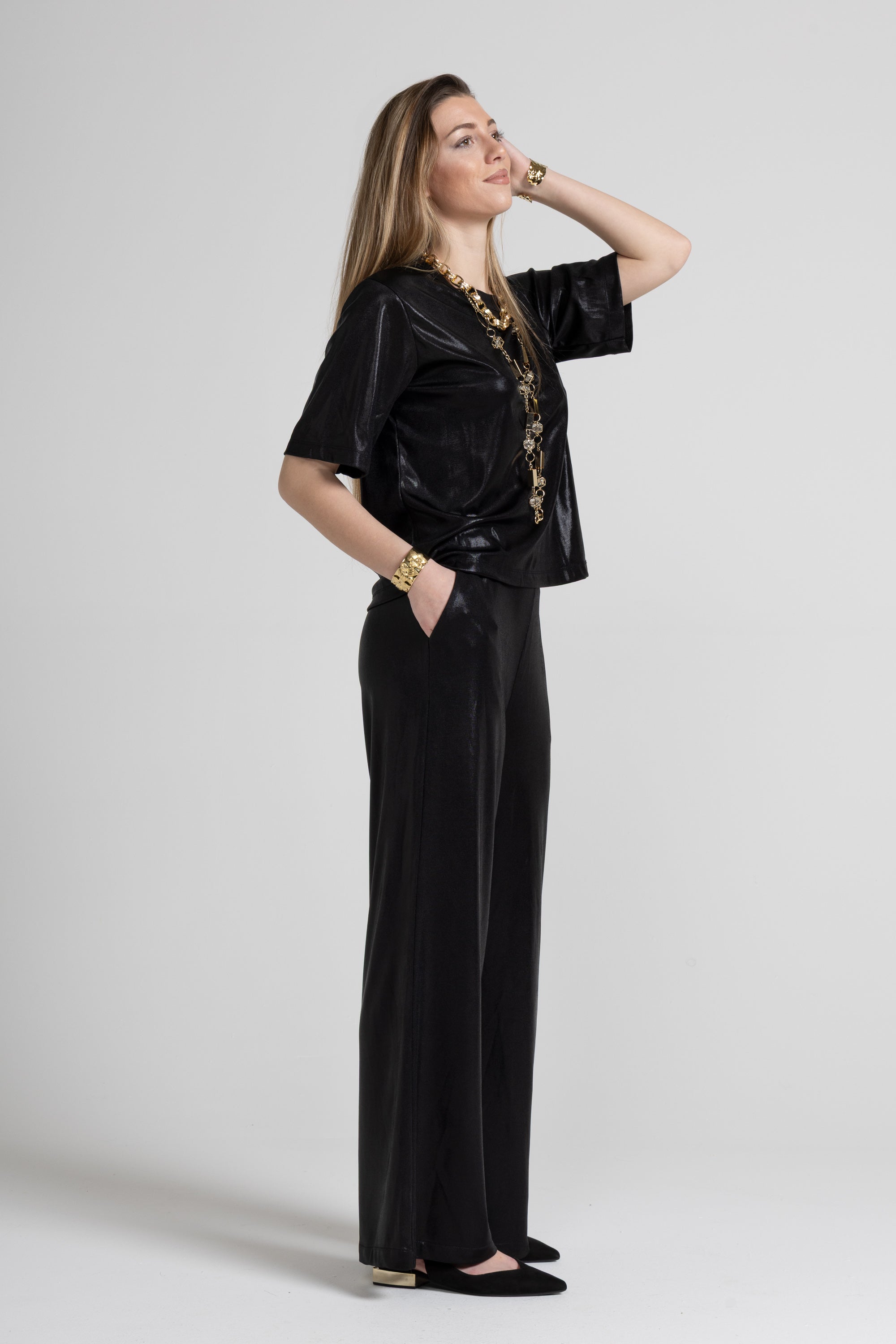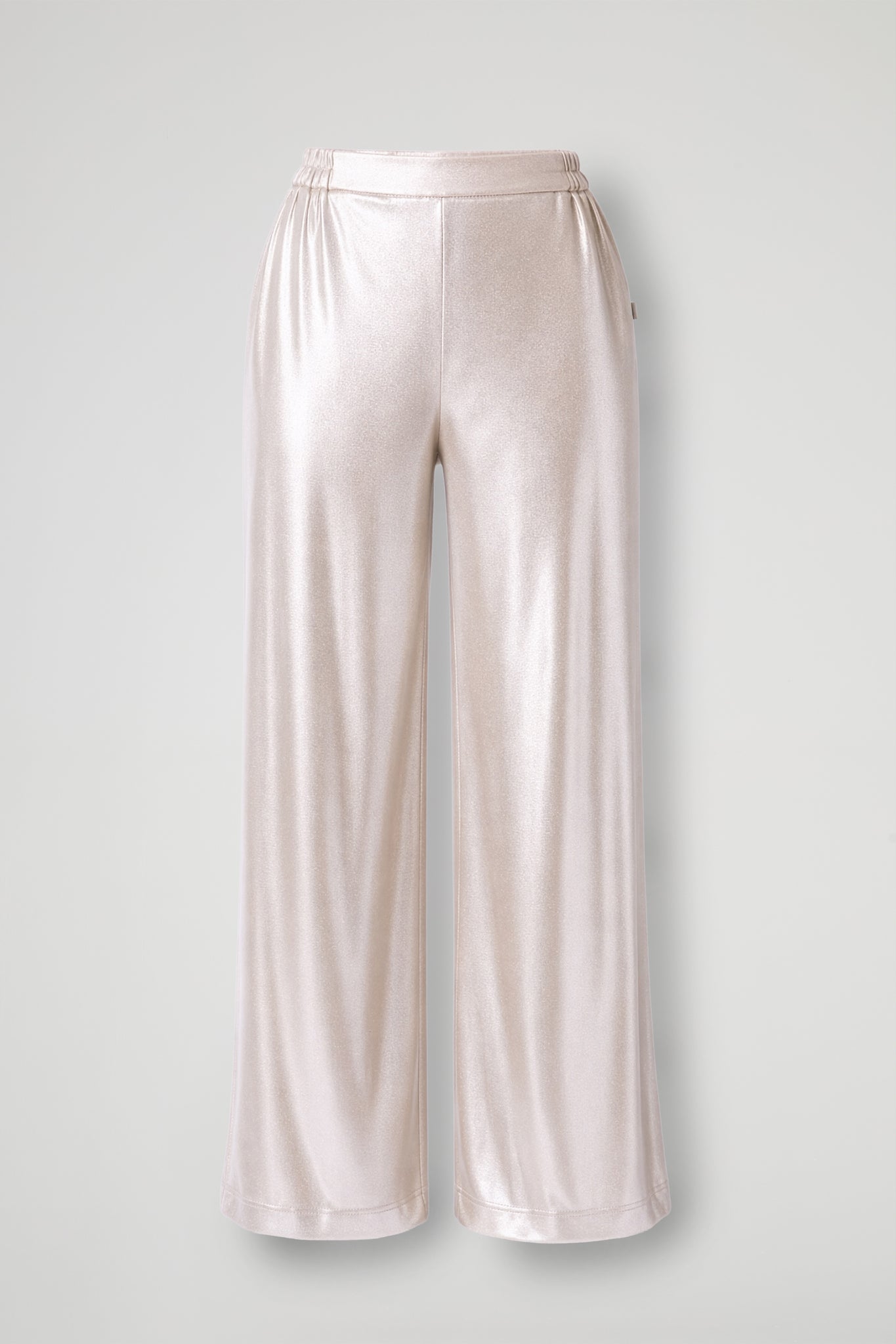 Pantaloni a palazzo dal tocco glow sono il pezzo perfetto per trasformare qualsiasi look: morbidi, fluidi e super comodi, slanciano la silhouette grazie alla vita alta e alla gamba ampia che cade dritta fino al fondo. Ideali per occasioni speciali, ma bellissimi anche con una semplice t-shirt e sneakers per un effetto glam quotidiano.
