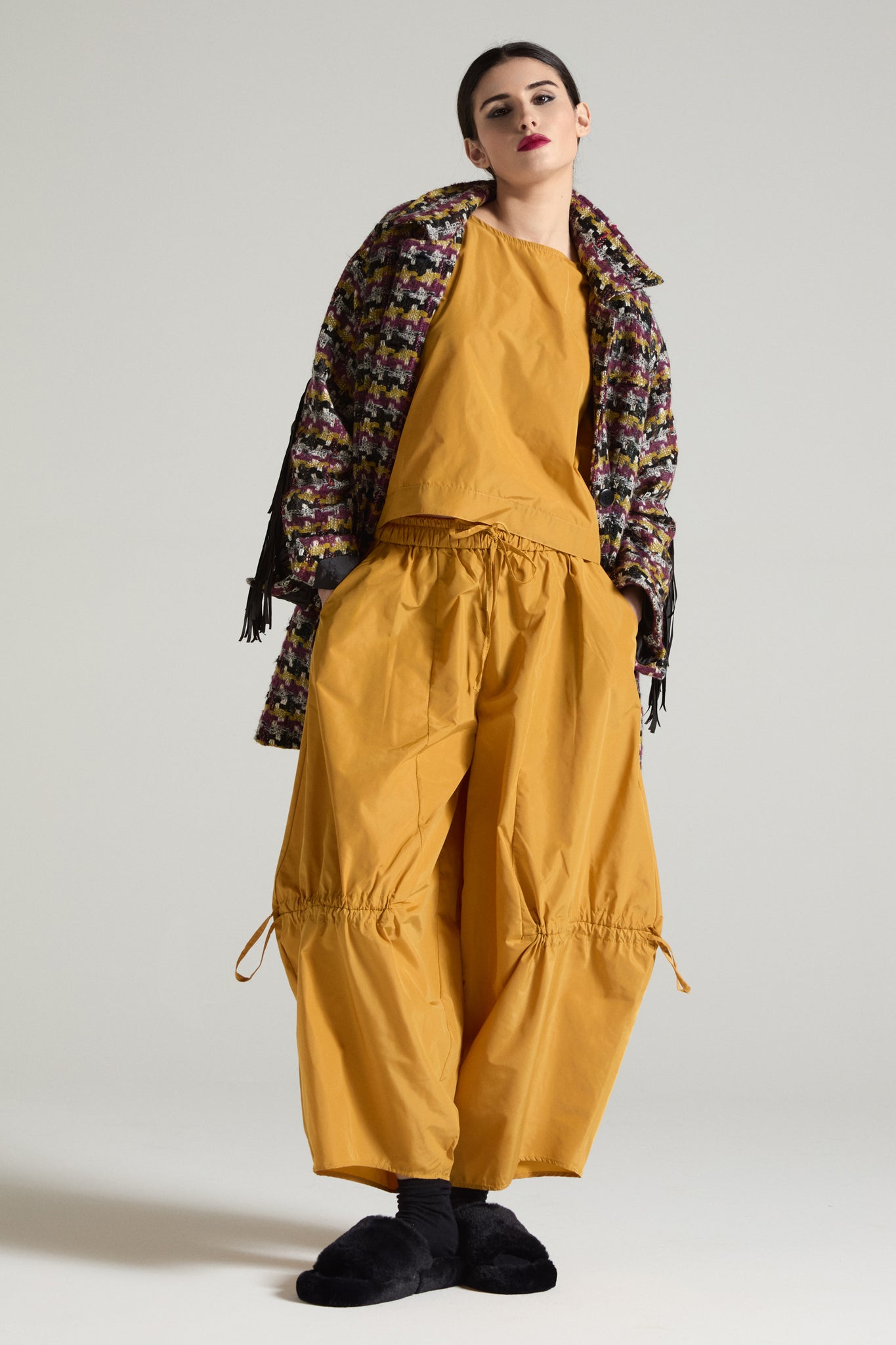 Pantalone baggy ,elastico in vita, tasche a filo, impuntura centrale con dettaglio laccetti con arricciatura , taglio a carrè sul retro.