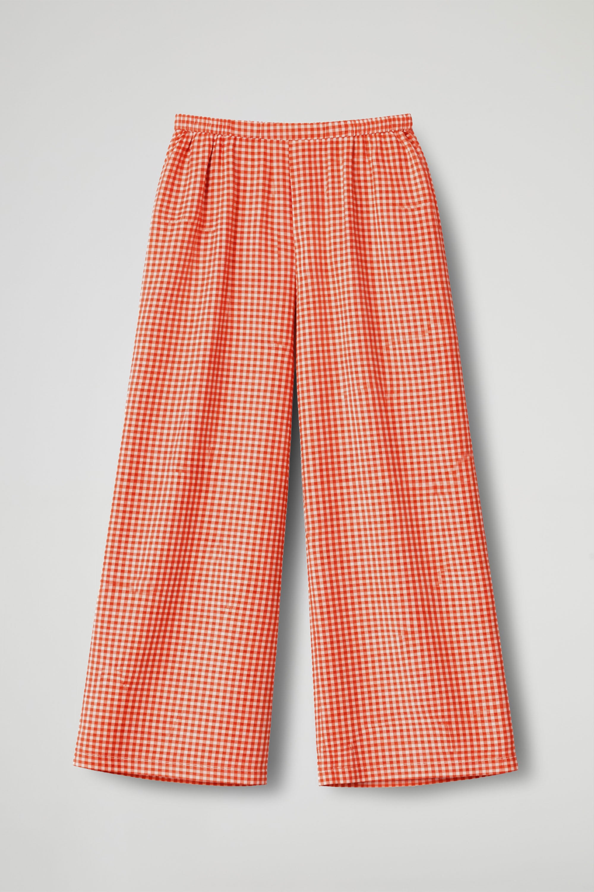Pantalone dalla linea morbida con una linea morbida e fluida, la gamba ampia scende dritta dalla vita fino al fondo, creando un effetto elegante e slanciato che dona movimento ad ogni passo. La fantasia Vichy, caratterizzata da piccoli quadretti regolari conferisce al pantalone un aspetto vivace, leggermente rétro e molto estivo.