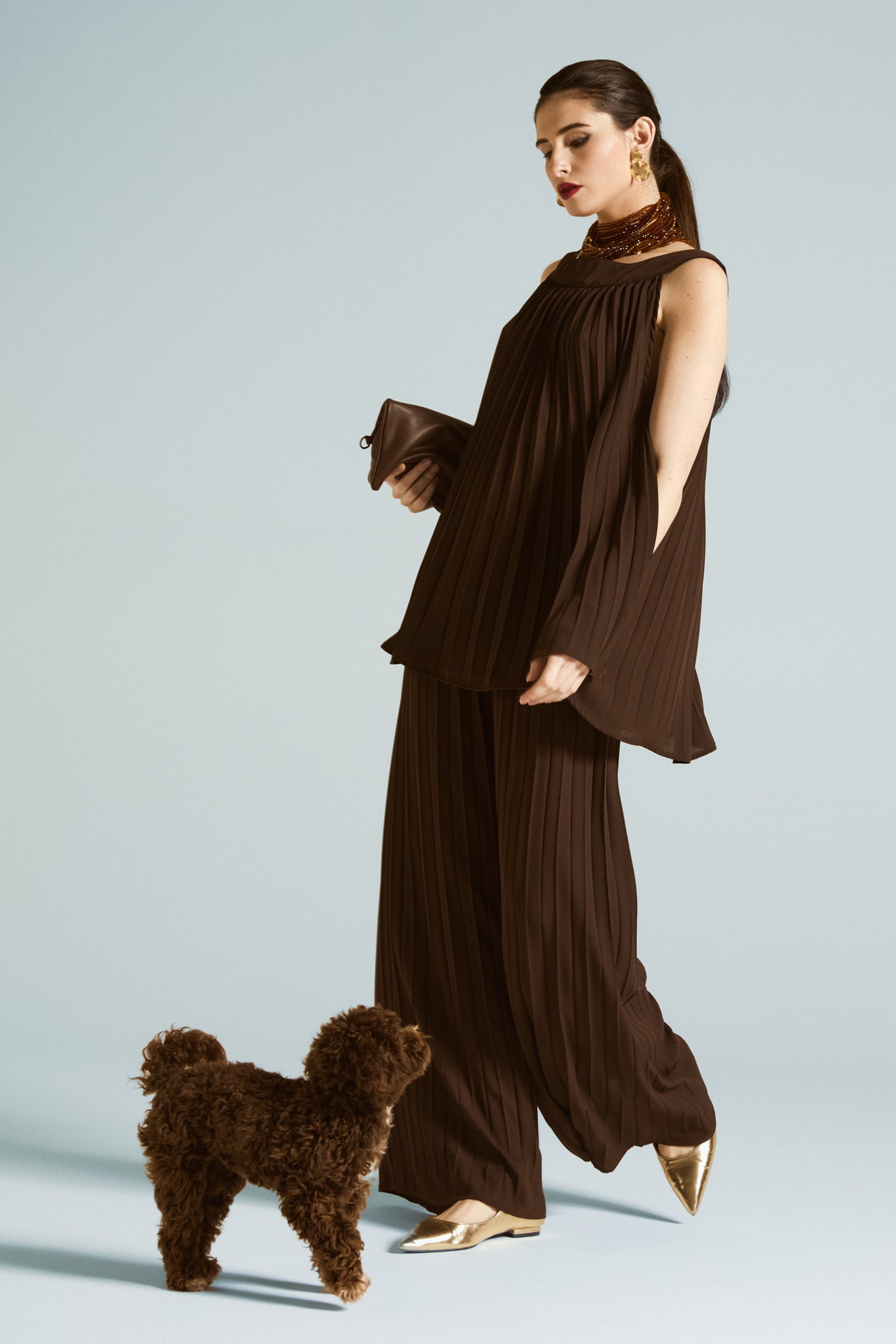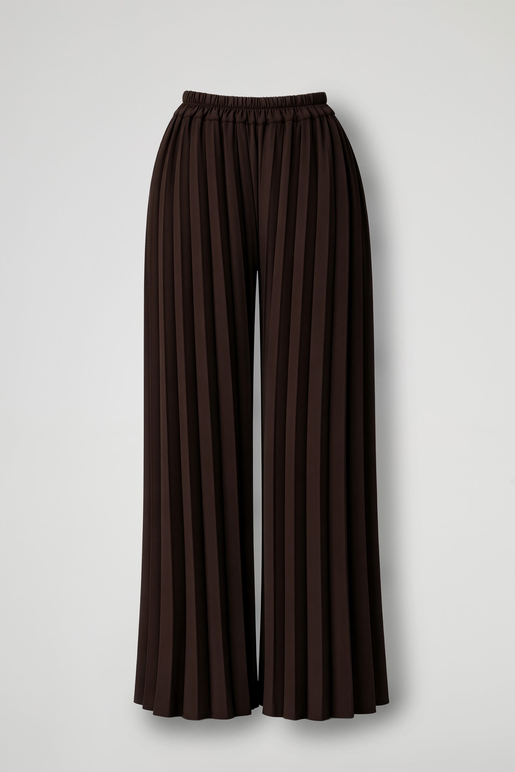 Pantaloni lunghi in plissé, dalla linea ampia e dal movimento molto fluido. La vita elasticizzata con arricciatura regolare assicura comfort e vestibilità facile, adattandosi bene al punto vita senza costringere, le pieghe verticali a tutta lunghezza creano un effetto ottico slanciante e donano al capo un look elegante ma versatile, perfetto sia di giorno che di sera. La gamba scende dritta e morbida fino al fondo, con un’ampiezza uniforme che accompagna il passo e valorizza la silhouette.