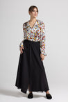 Blusa asimmetrica, scollo a V con piccolo revers, maniche lunghe con dettaglio spacchetto e orlo alto su polsi, chiusura frontale con bottoni. Linea morbida