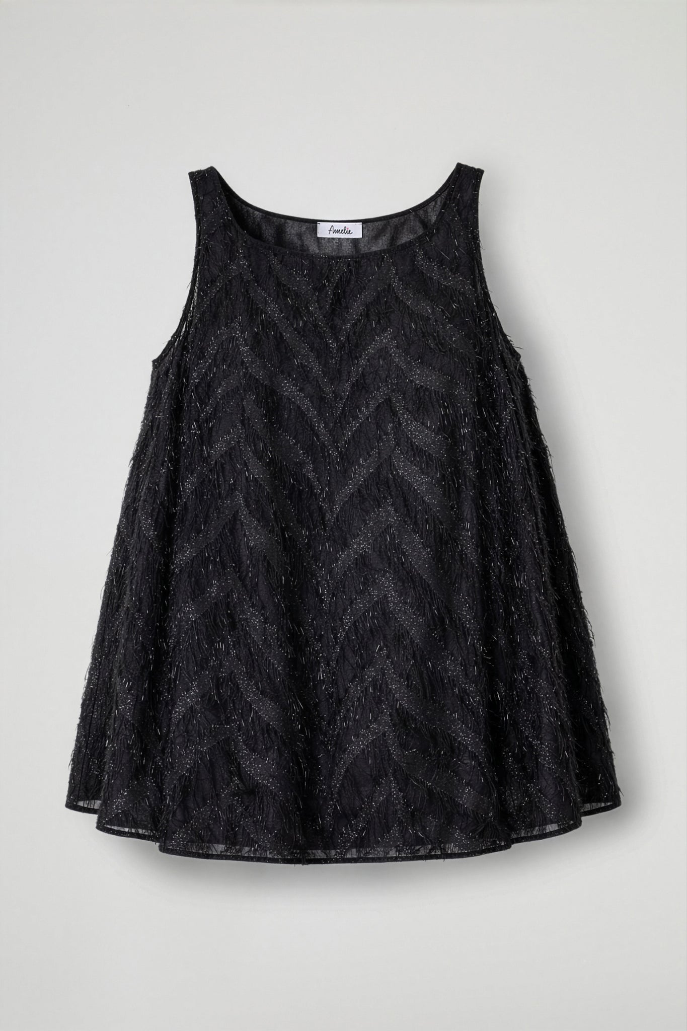 Canotta smanicata in tessuto leggero semi-trasparente, arricchita da una lavorazione di micro-lurex che riflette la luce con discrezione mentre la texture piumage crea profondità e movimento ad ogni passo ; Il design è pensato per essere comodo ma scenografico: scollo tondo pulito, spalline larghe e linea morbida e svasata che scivola sul corpo senza segnare, con un fondo leggermente stondato che accompagna la silhouette.