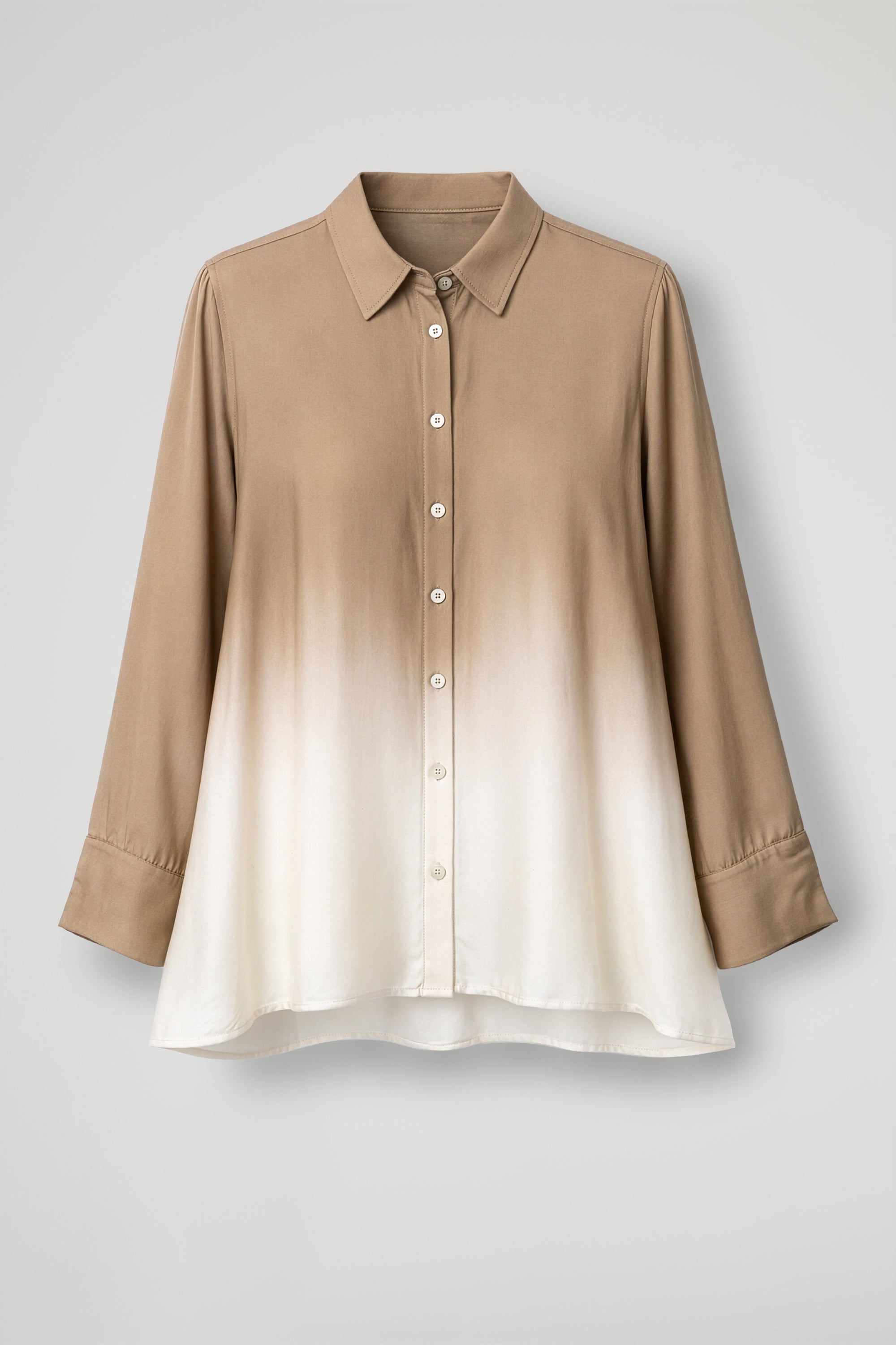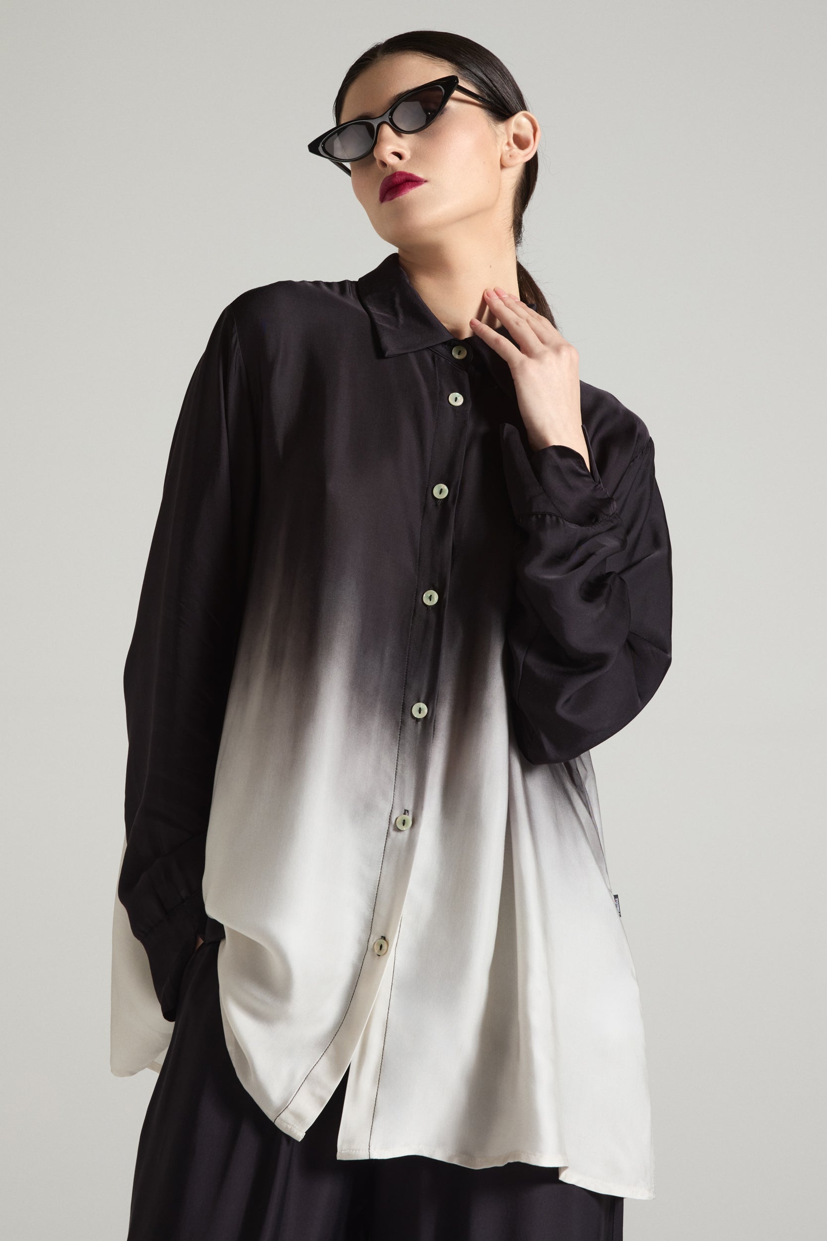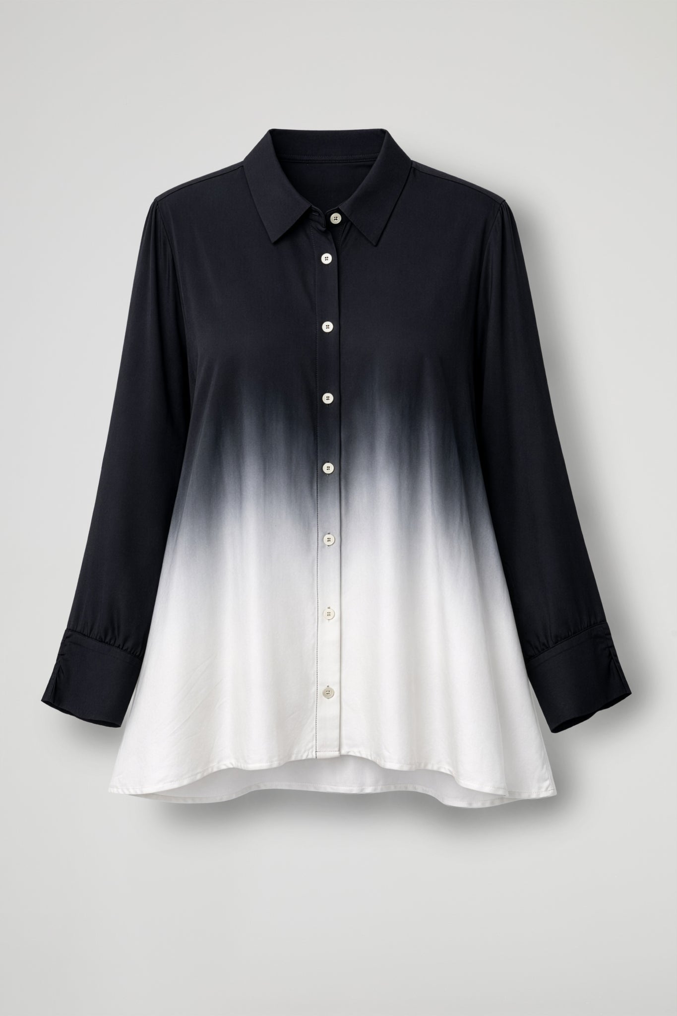 Camicia Over, colletto classico, spalla leggermente scesa, manica lunga con polsino alto, chiusura frontale con bottoni, sfumature degradè sul fondo. Line ampia.