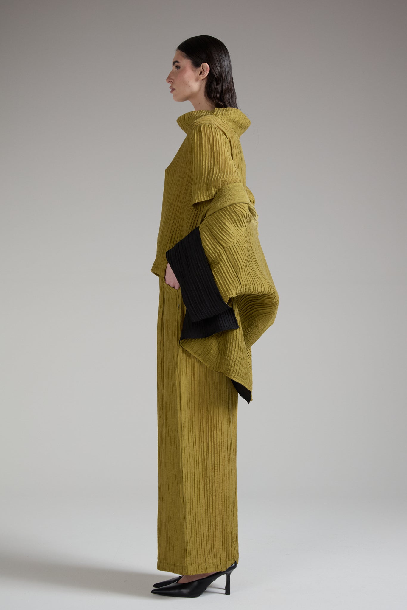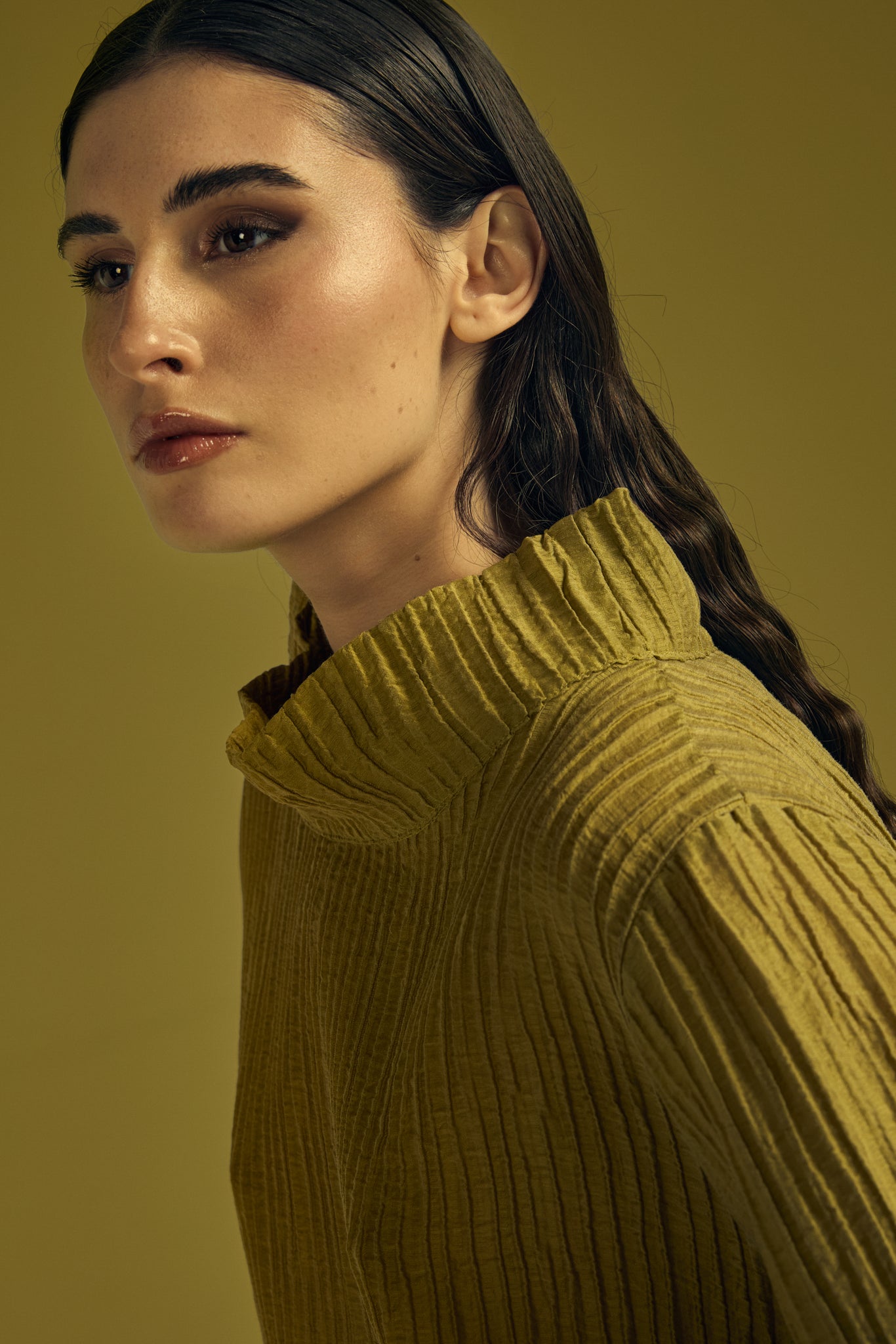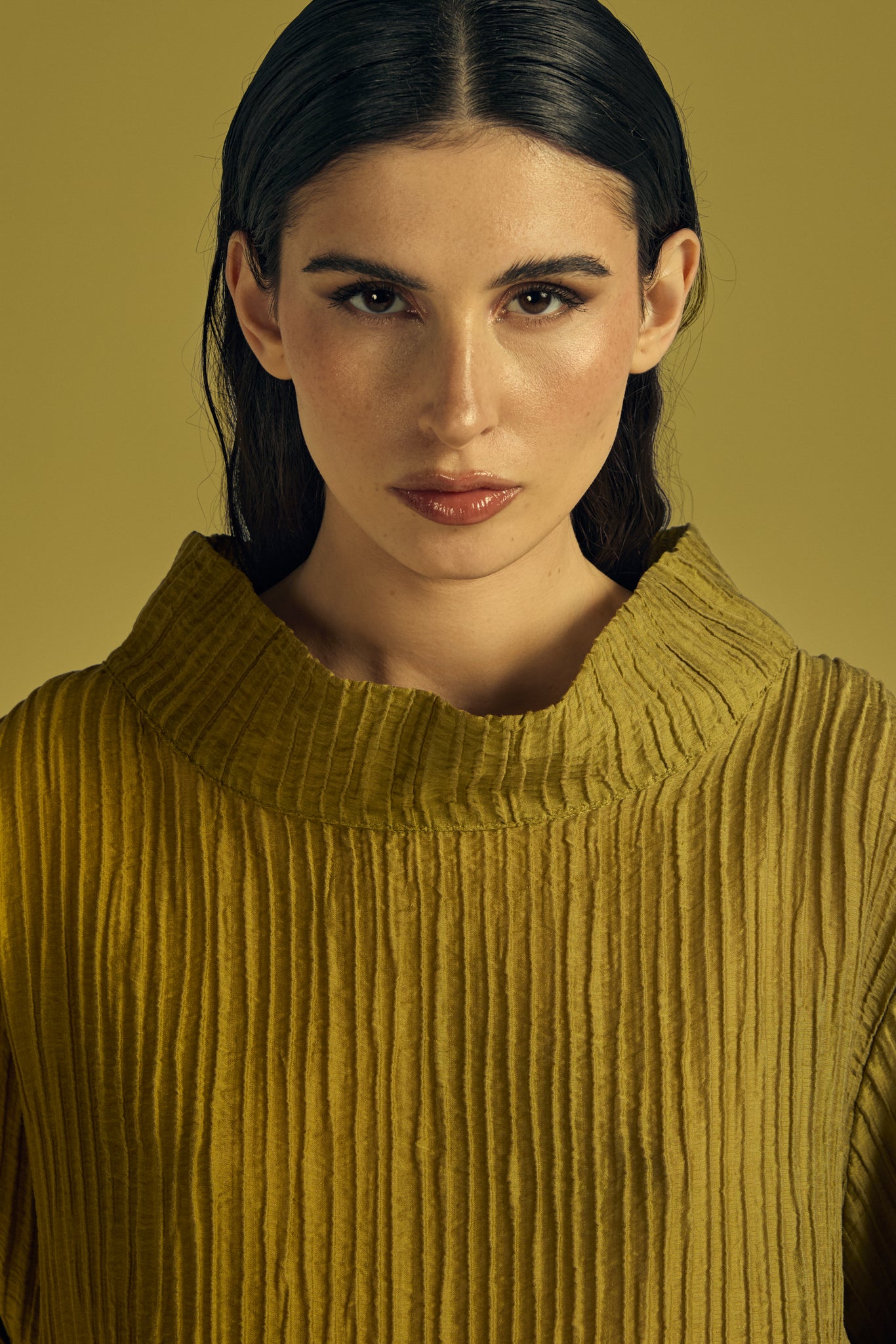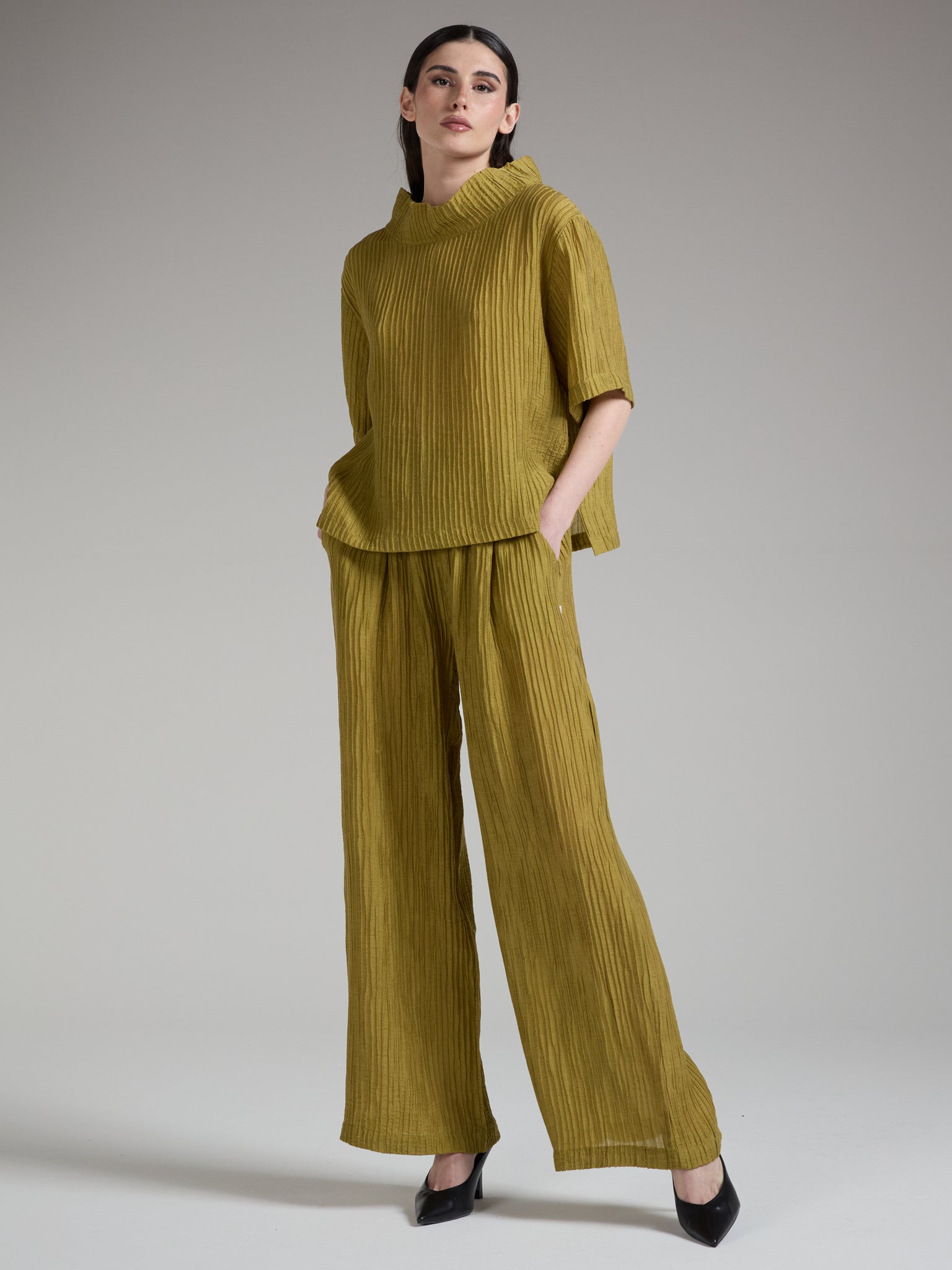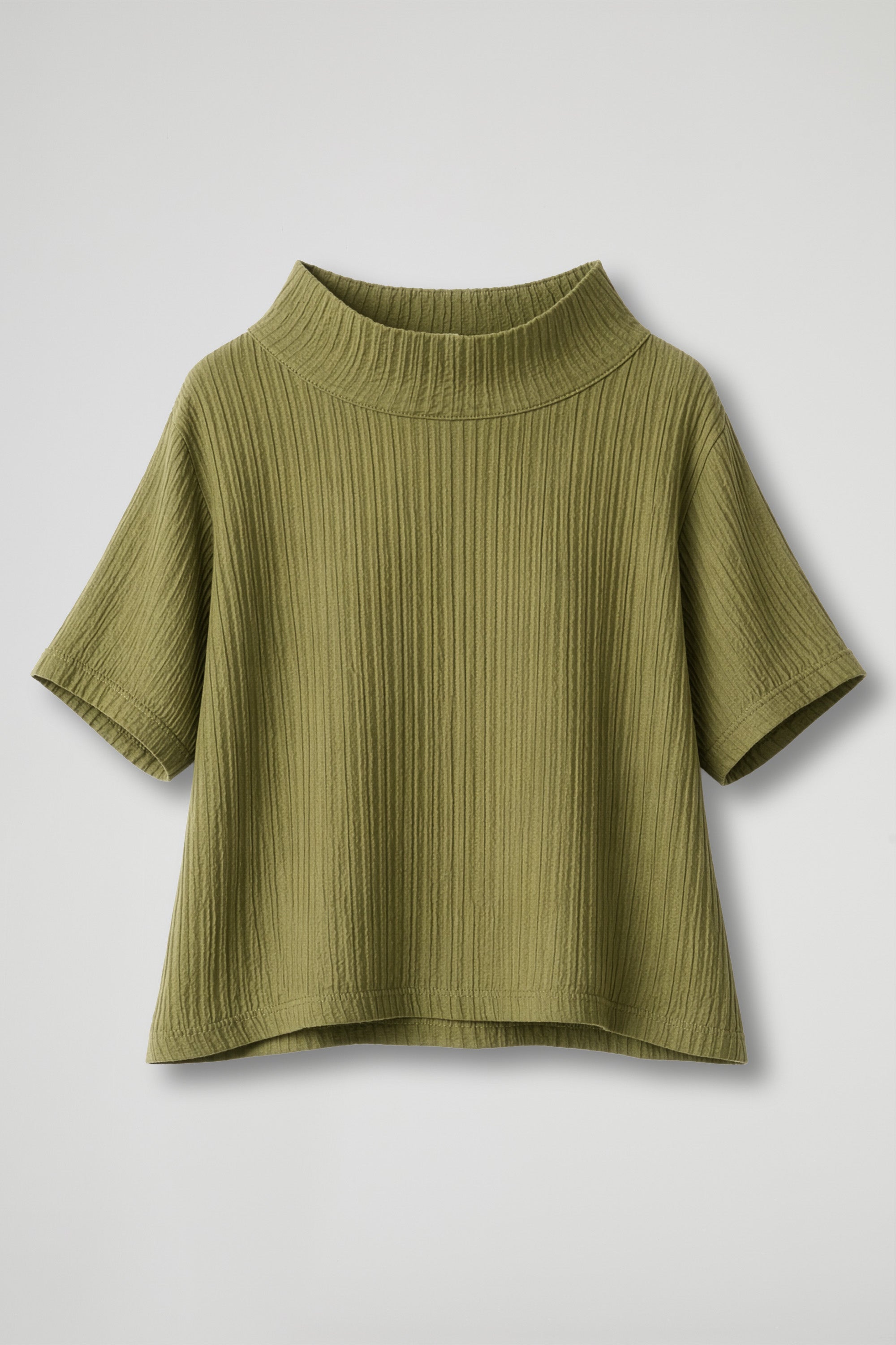 Top taglio boxy leggermente asimmetrica realizzato in tessuto goffrato, collo ad anello in piedi, manica corta con orlo ribattuto, dettaglio a costine su tutto il capo, orlo ribattuto sul fondo. Linea ampia