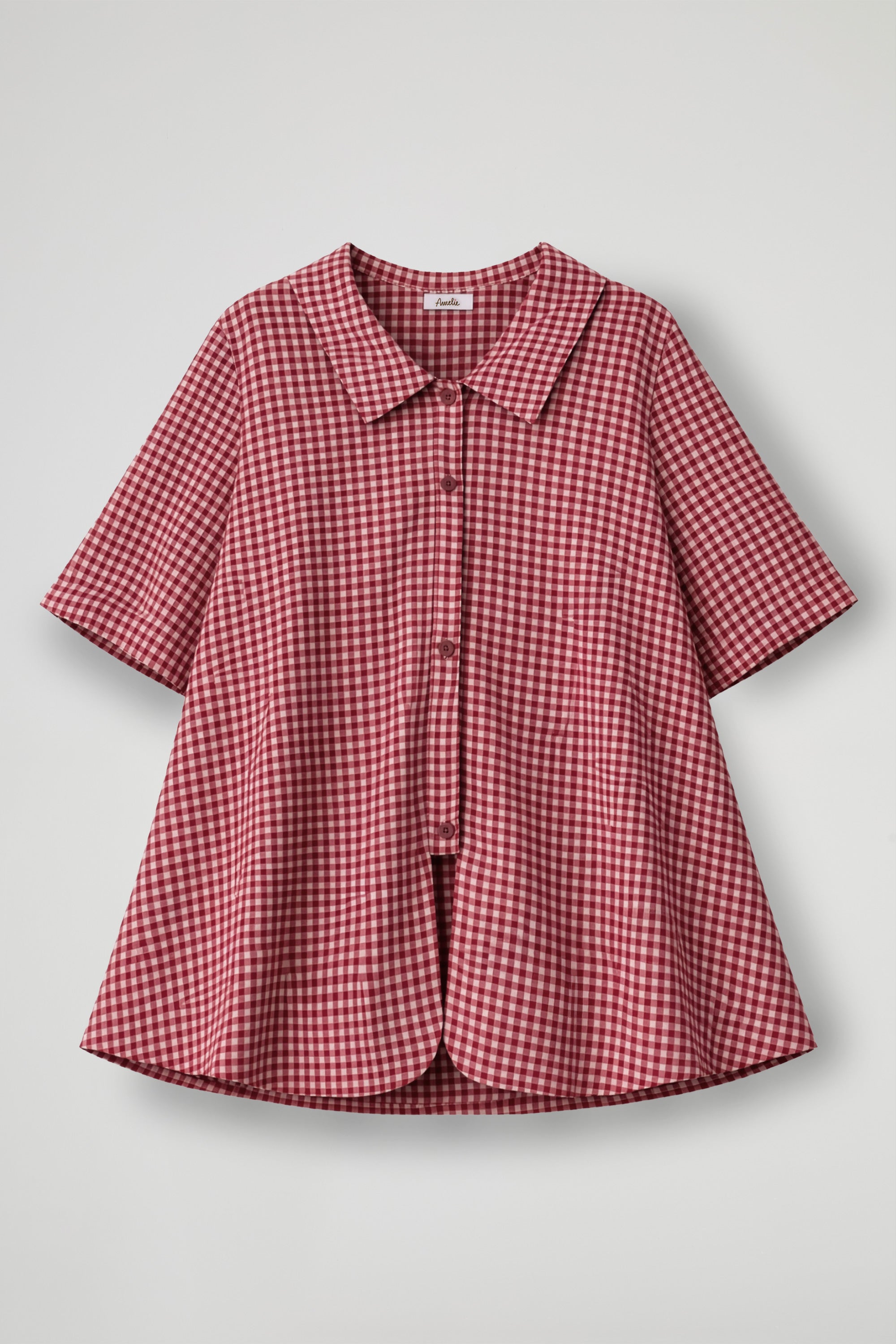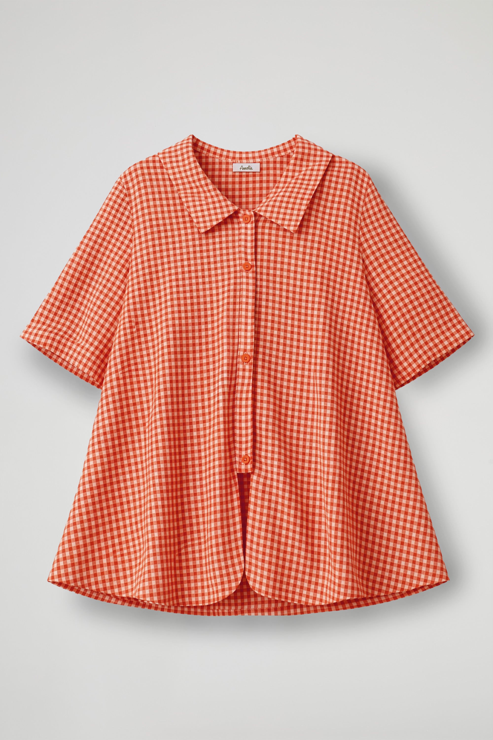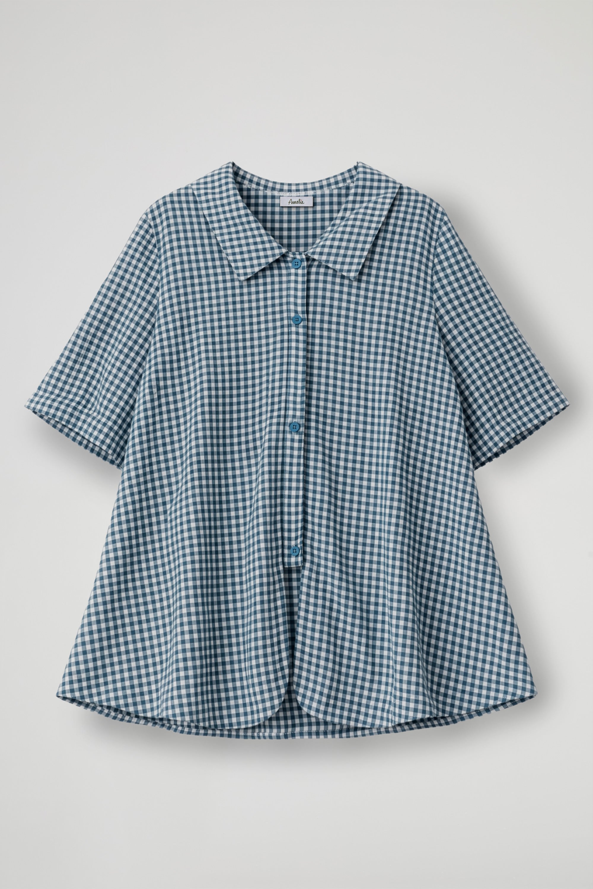 Camicia dal gusto fresco e senza tempo, realizzata in leggero cotone a quadretti vichy; Il design si distingue per il colletto ampio e strutturato che incornicia delicatamente il décolleté, mentre la chiusura frontale con bottoni aggiunge un tocco classico e versatile. La linea è fluida e rilassata, pensata per valorizzare ogni silhouette senza costrizioni, mentre le maniche a tre quarti donano praticità e un’eleganza disinvolta.