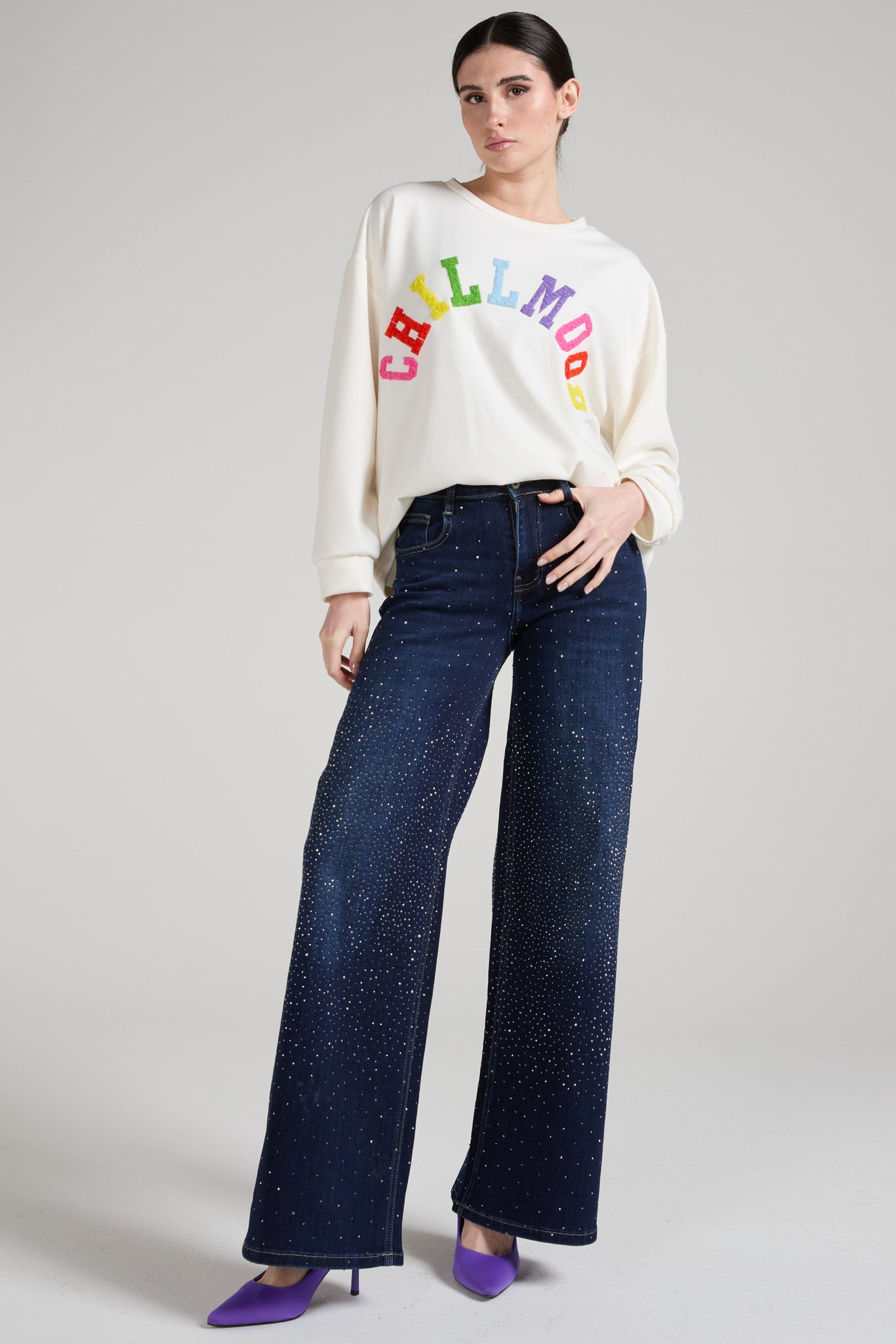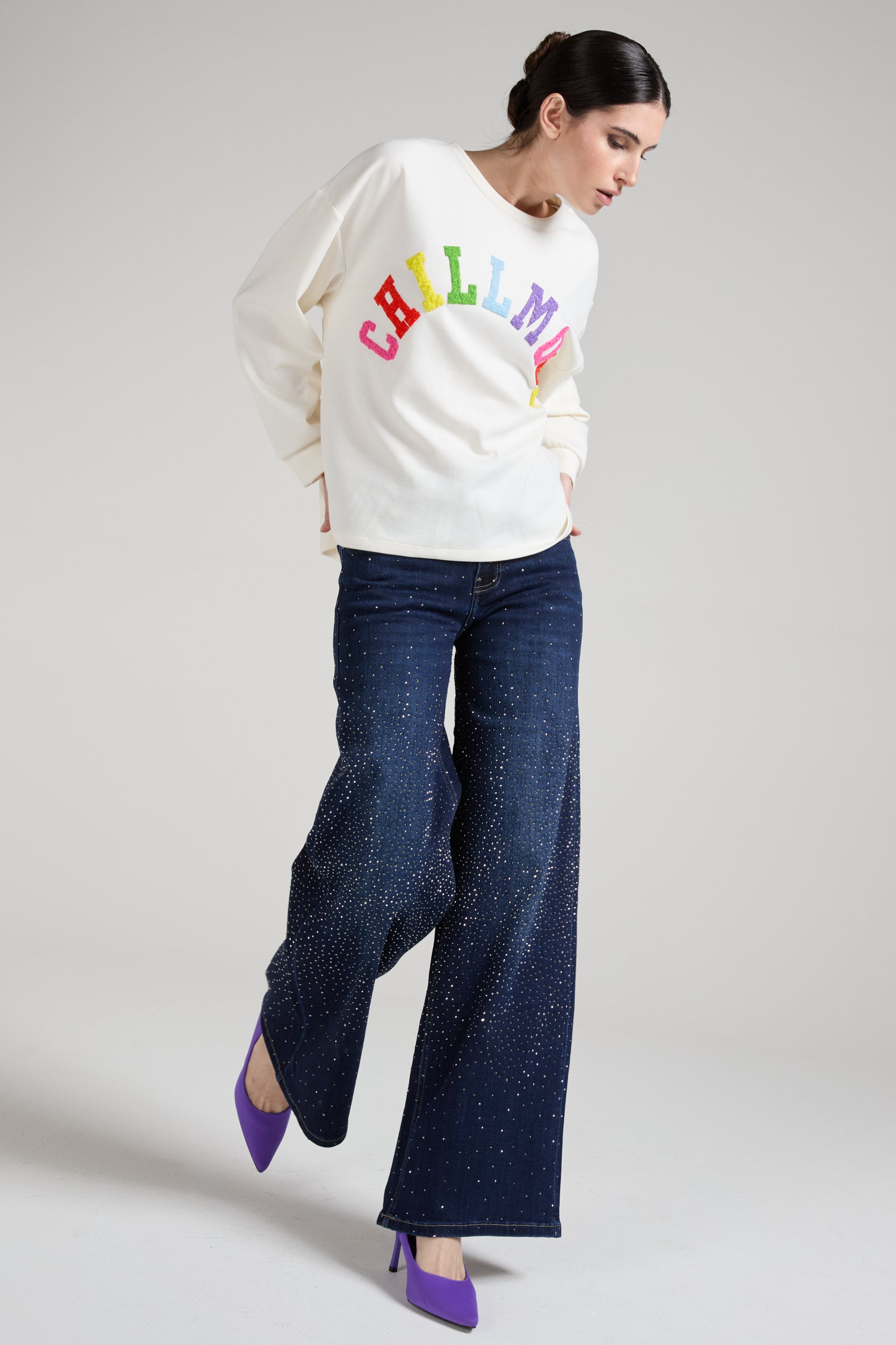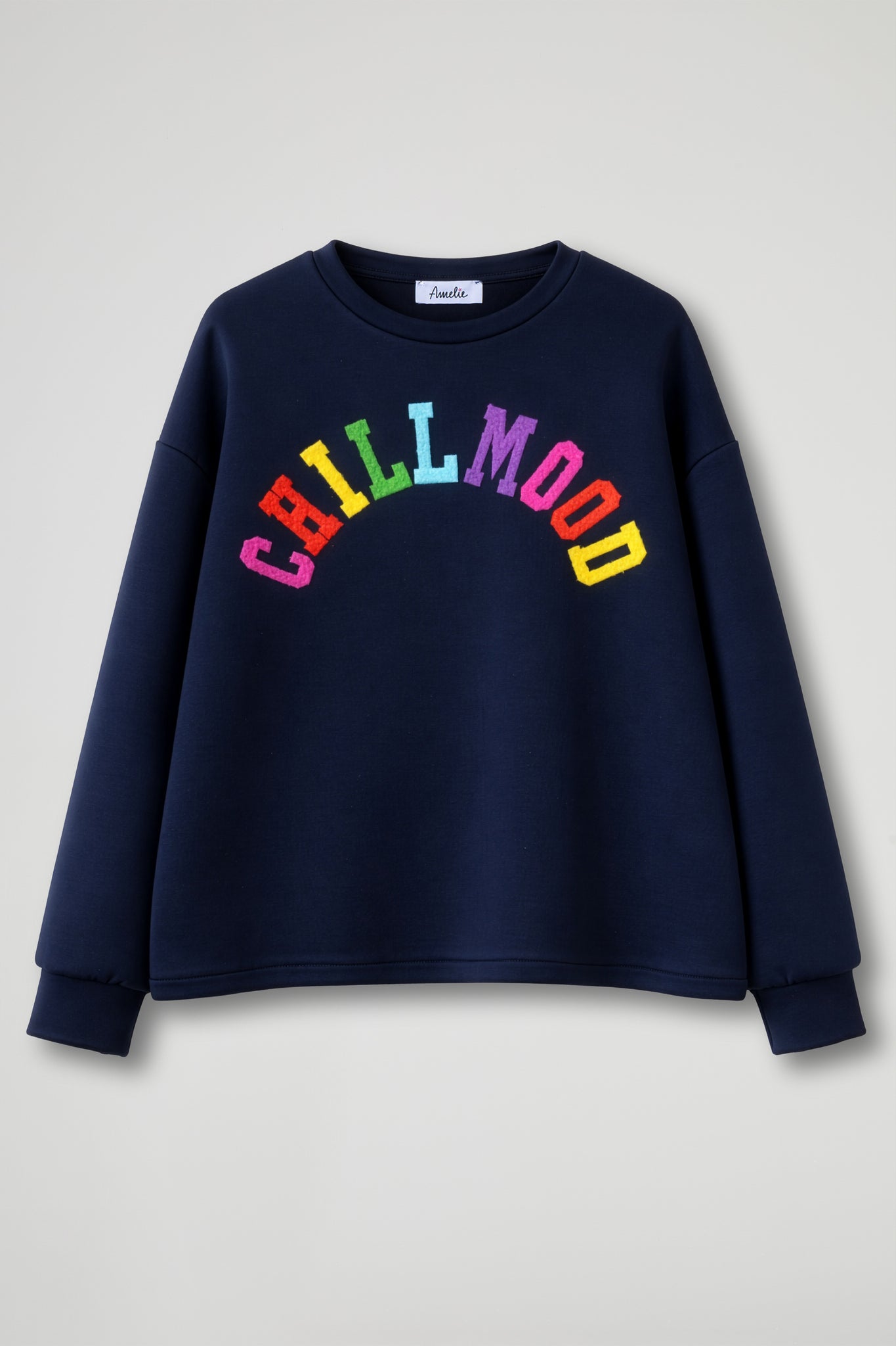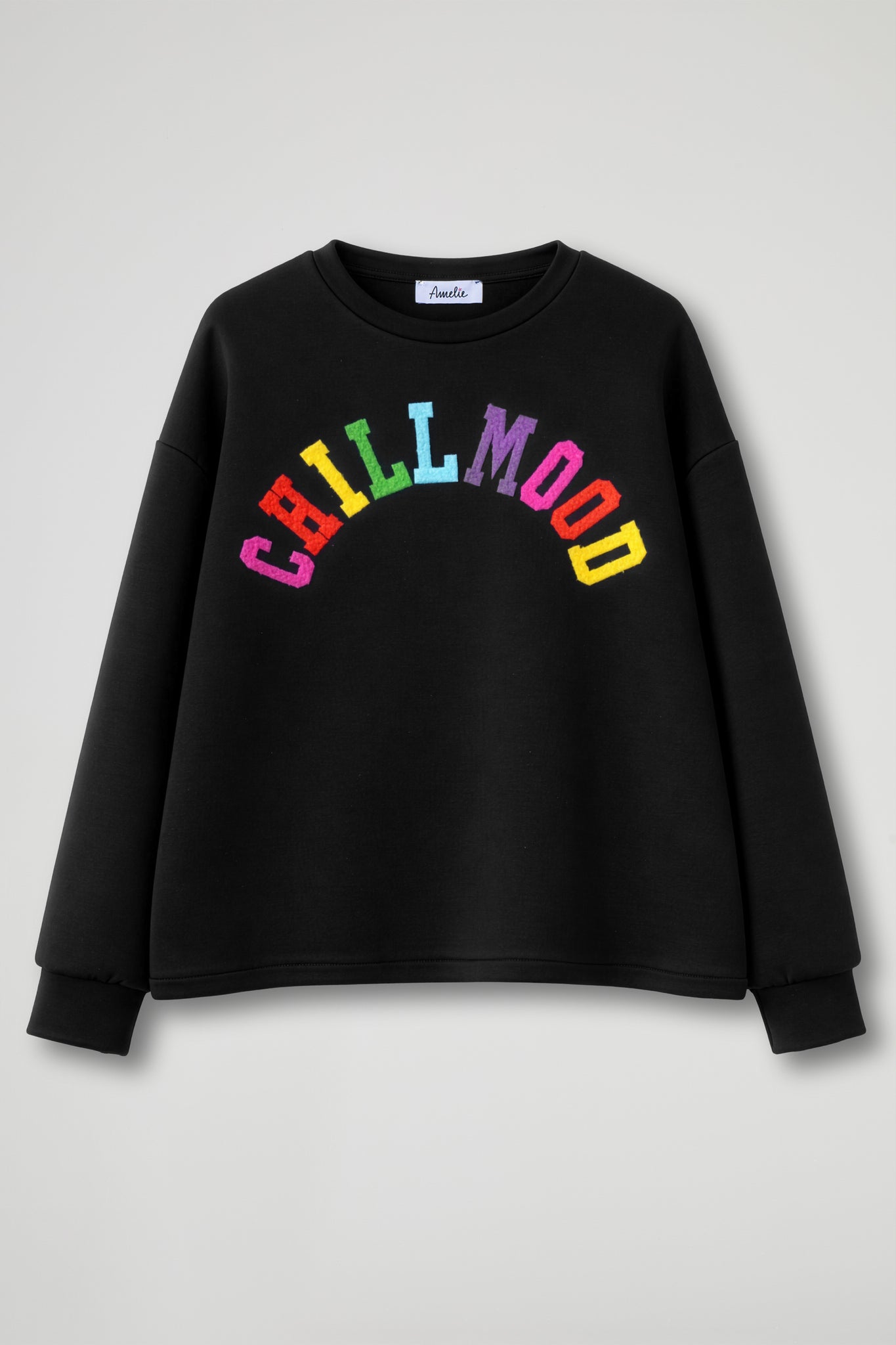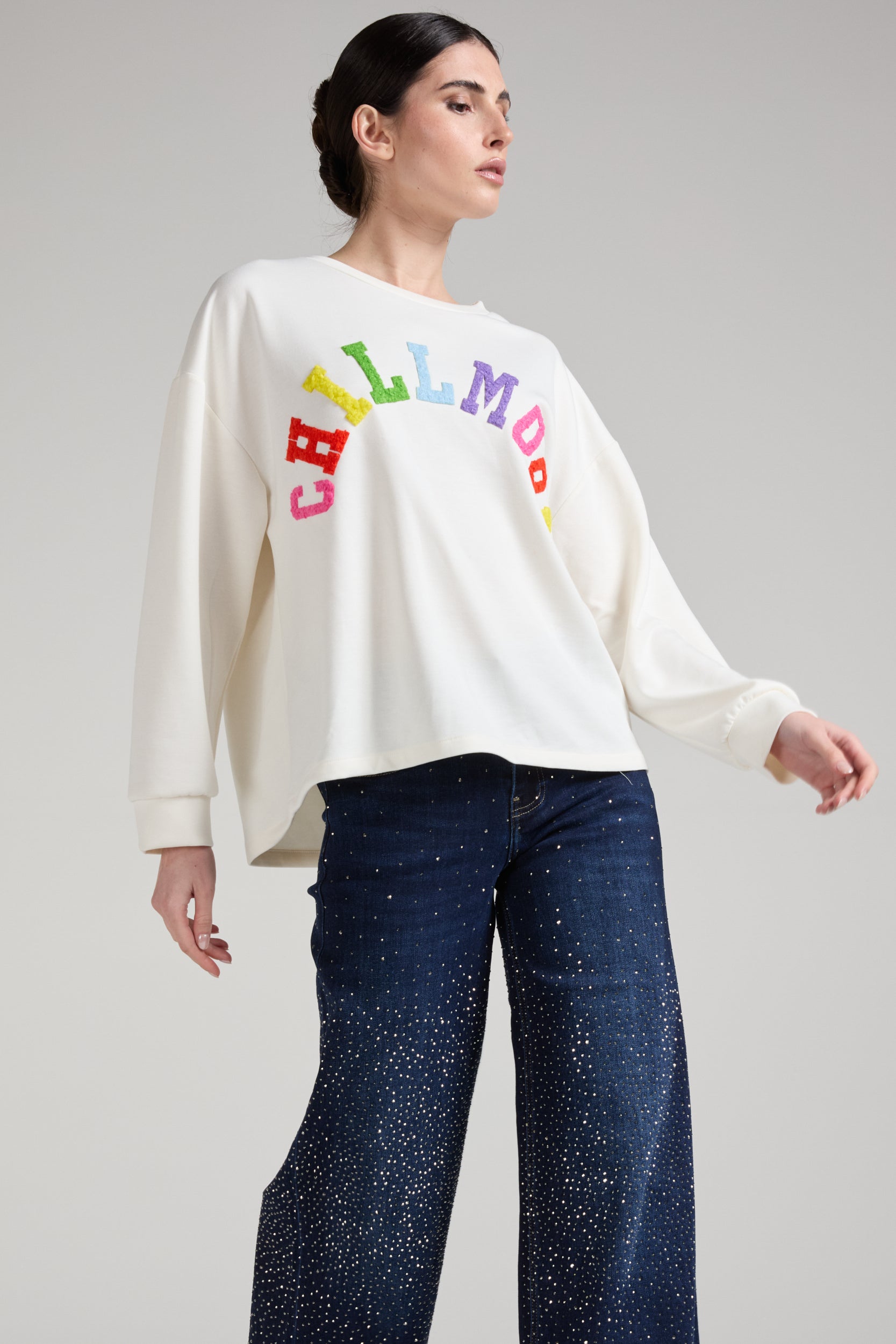 Top a maniche lunghe dal taglio morbido e confortevole, con girocollo classico. Sul davanti presenta una stampa colorata ad arco con la scritta “CHILLMOOD” in lettere vivaci e multicolor (rosa, rosso, giallo, verde, azzurro e viola), che crea un effetto allegro e moderno. Il design minimal del capo è valorizzato dal contrasto tra il fondo e la grafica brillante, rendendolo ideale per look casual e contemporanei.