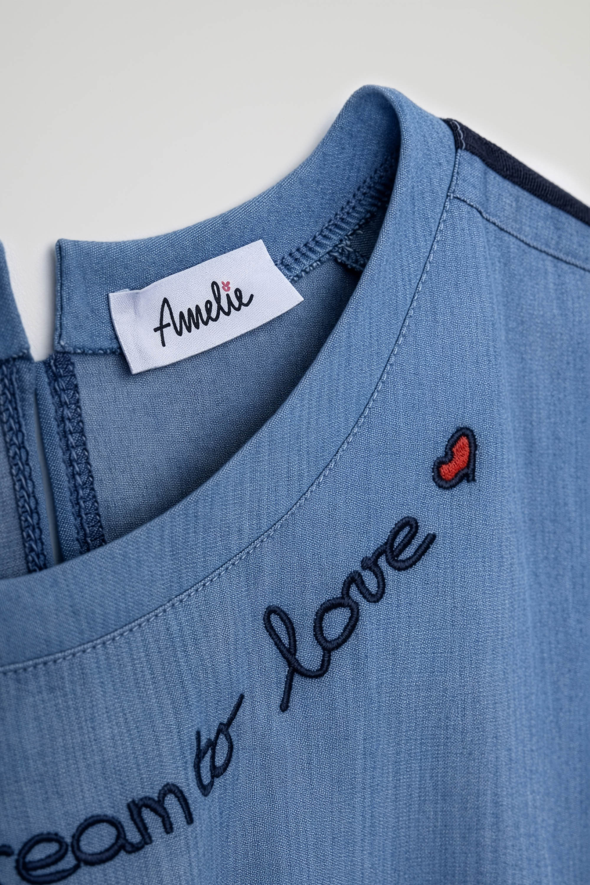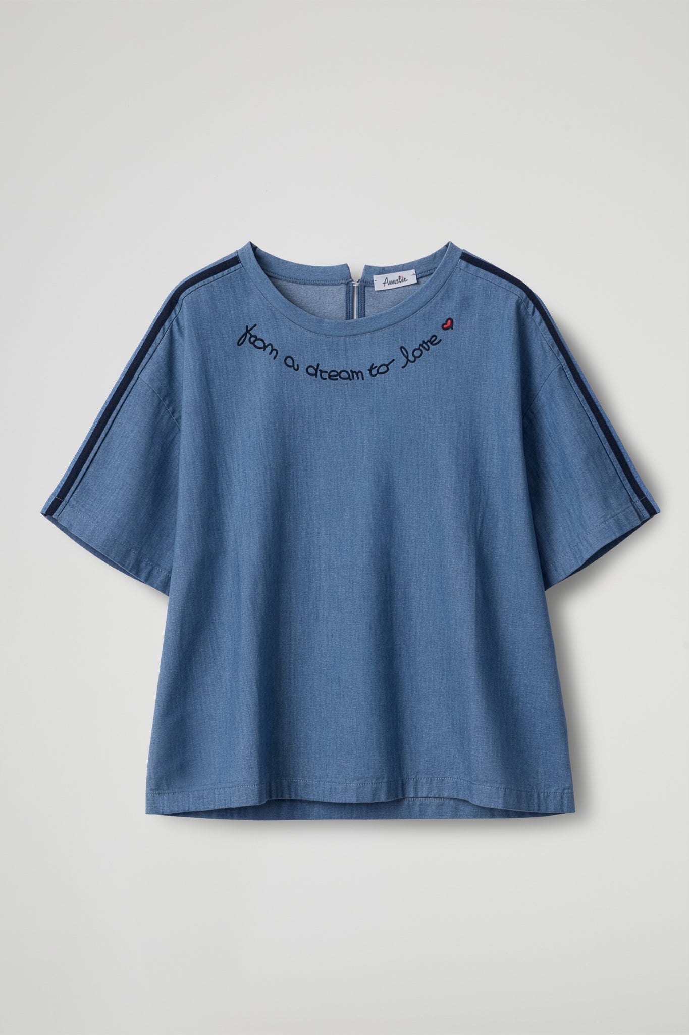Blusa a manica corta realizzata in tessuto leggero effetto denim, caratterizzata da una mano morbida e confortevole a contatto con la pelle. Il modello presenta una linea ampia e leggermente boxy; Il design è definito da uno scollo rotondo pulito e da una chiusura con zip sul retro, pratica e discreta. Sul davanti spicca una scritta ricamata dal tratto fine accompagnata da un piccolo cuore applicato, dettaglio decorativo che dona un tocco femminile e distintivo al capo.